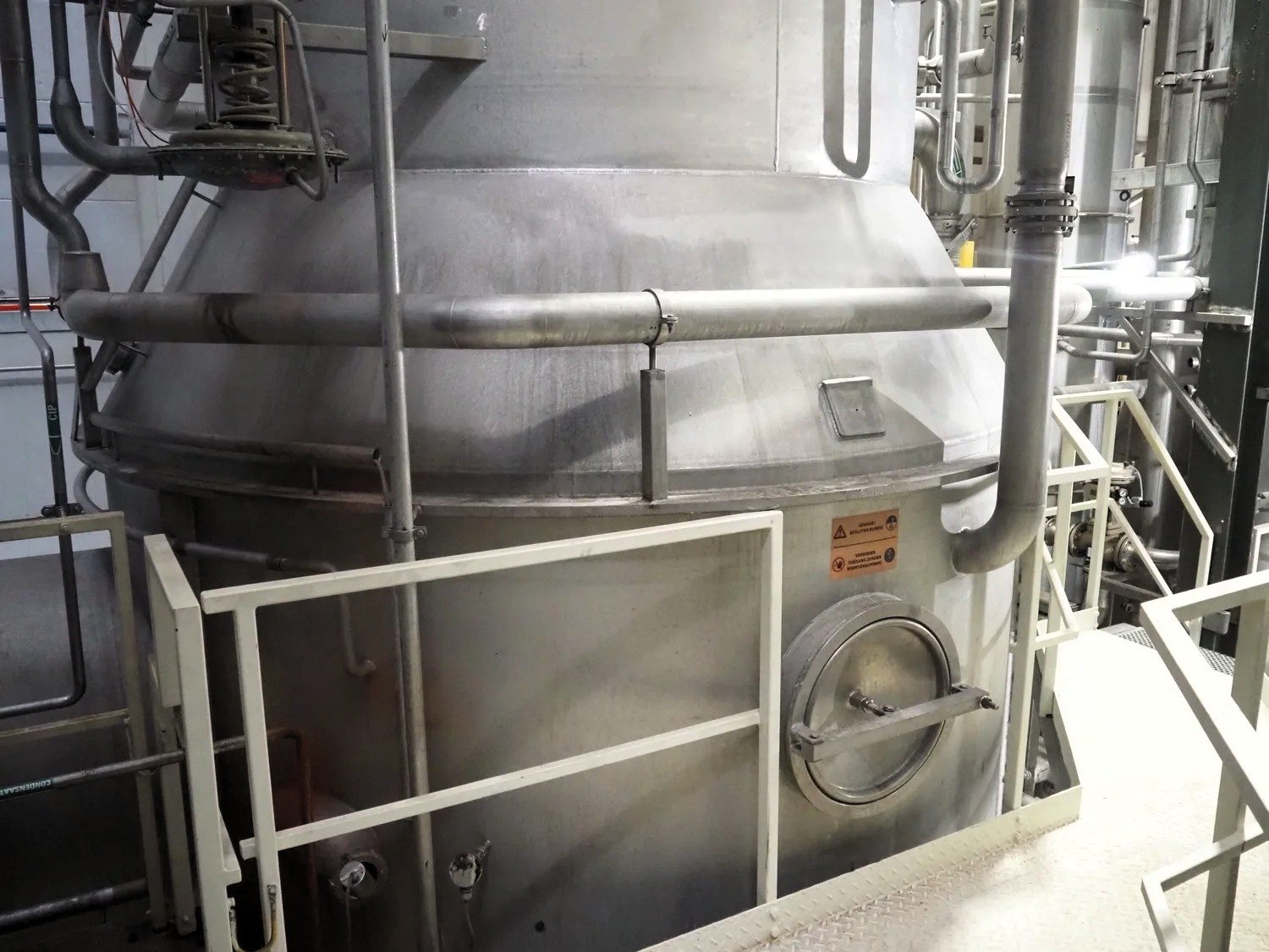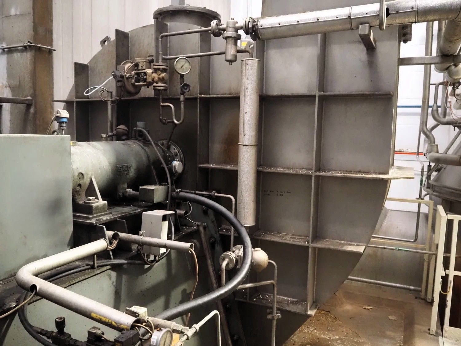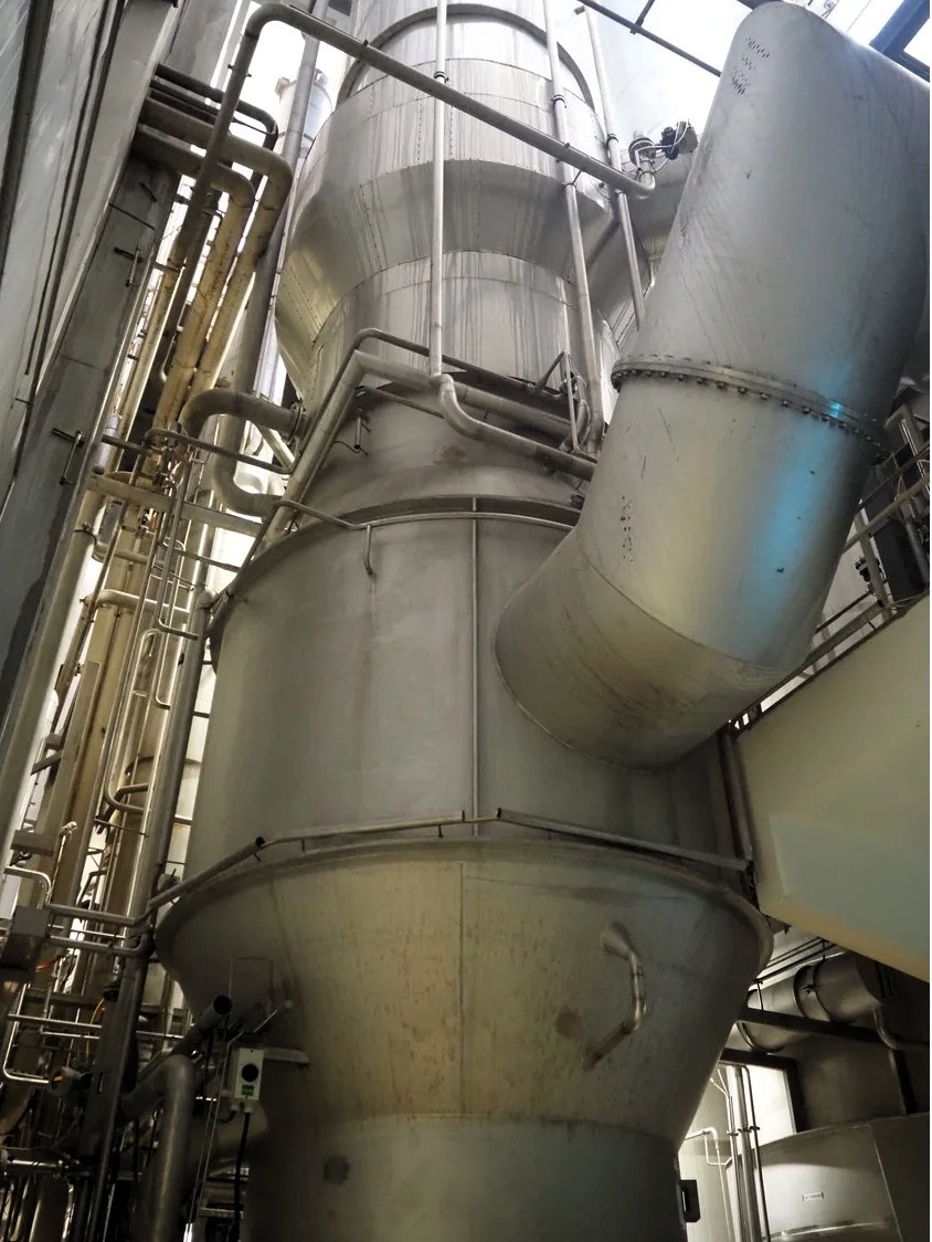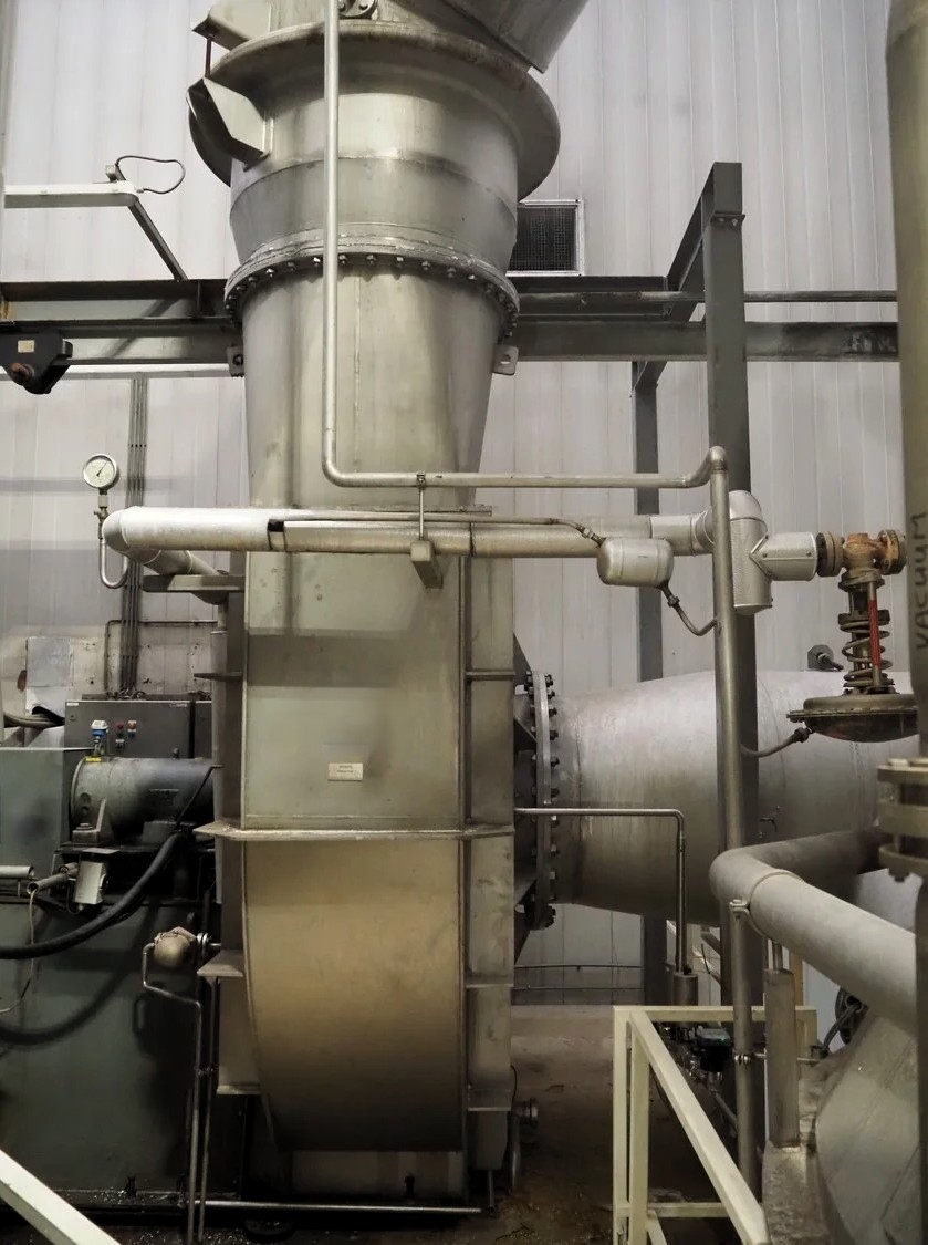 Evaporator GEA Wiegand MVR & Ventilator Pillar 5257 KKXGAE80800This 4-stage evaporator, used for whey processing, is equipped with Mechanical Vapour Recompression (MVR) to ensure high energy efficiency. The unit has a capacity of 65 tons/hour feed at 5.7% total solids and a product temperature of 30–34°C. The volume per stage is 37.8 / 52.4 / 0.4 / 0.18 m³ respectively. The system is already dismantled and ready for transport and reinstallation. Supplied with a spare motor and frequency converter"