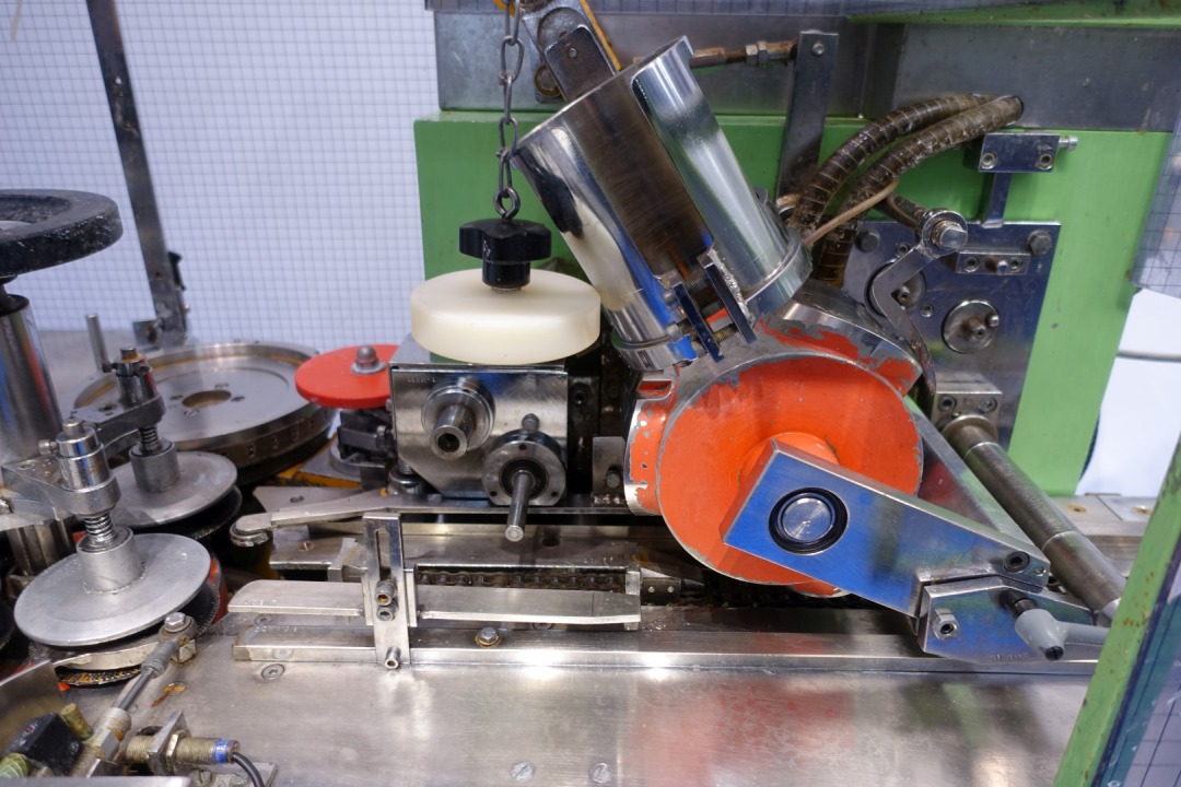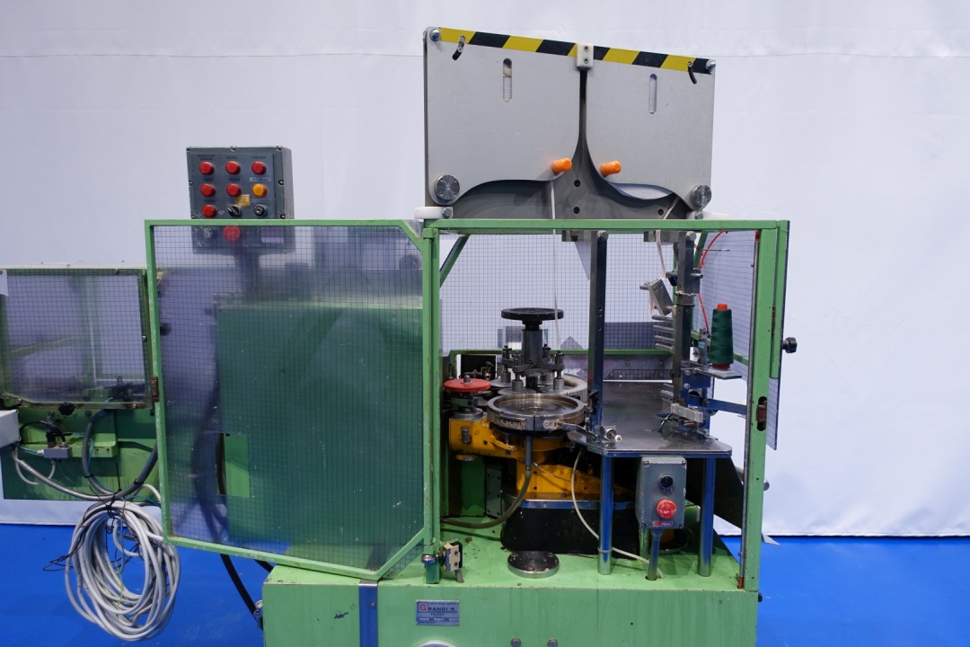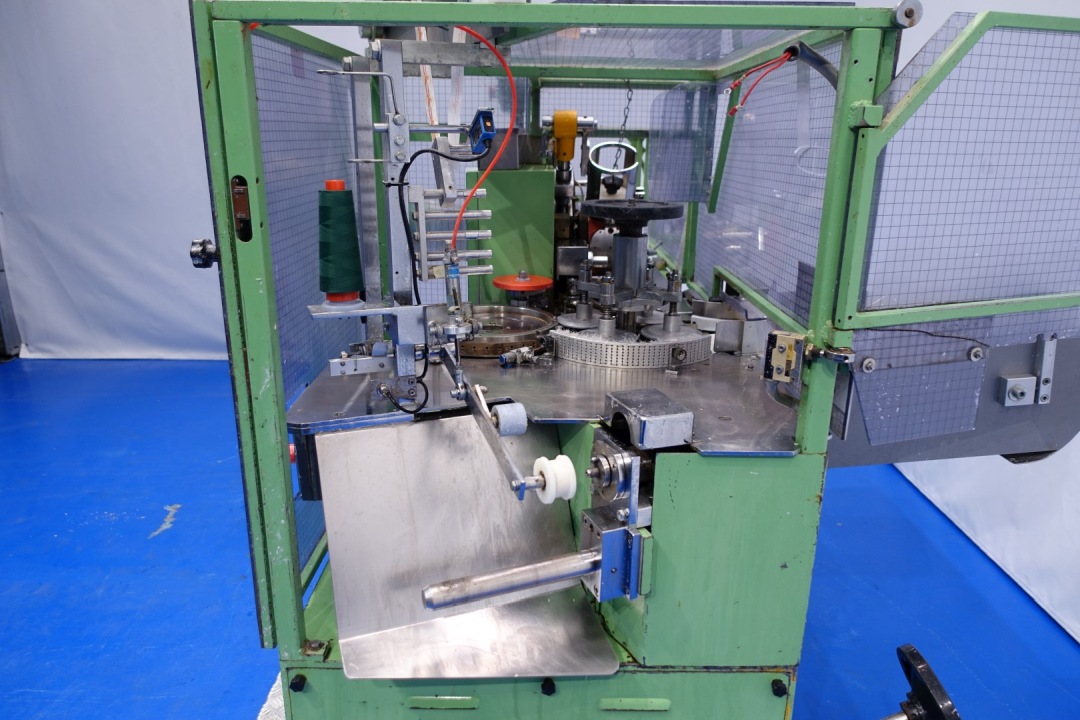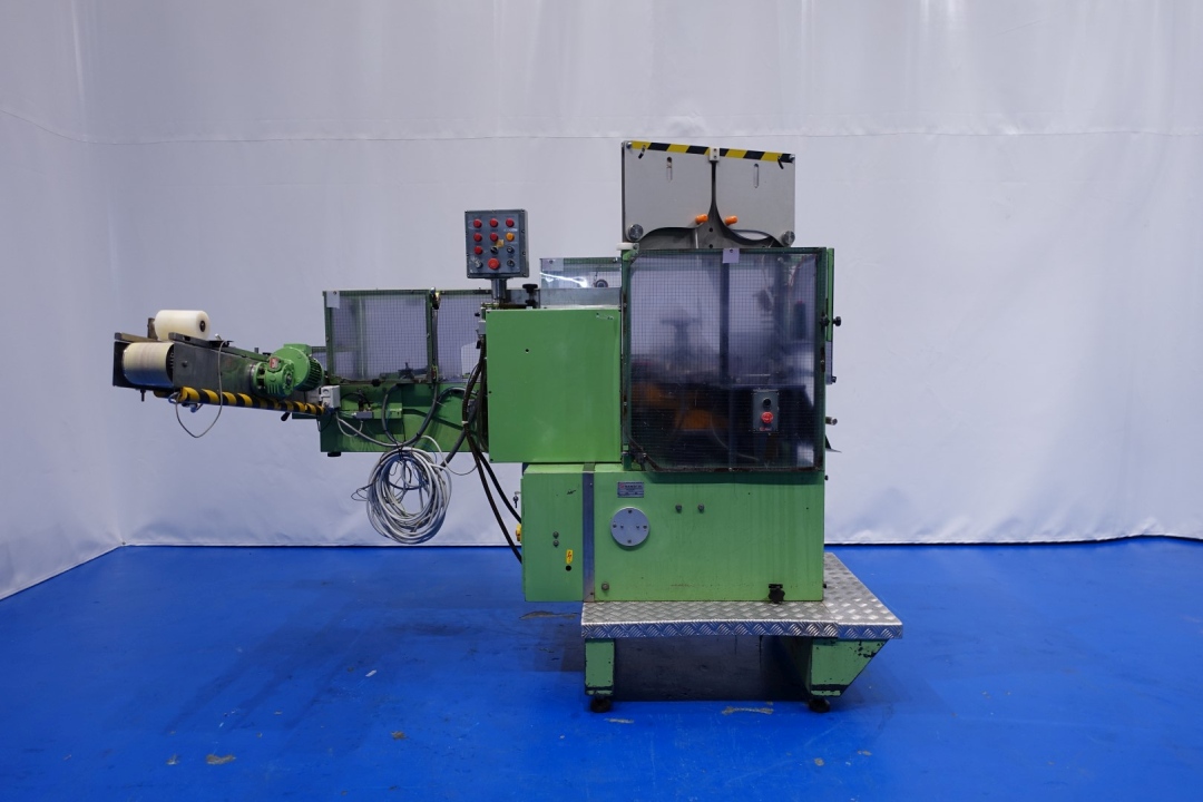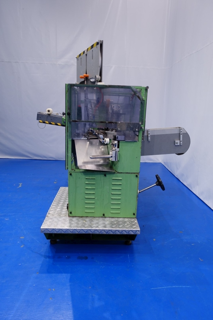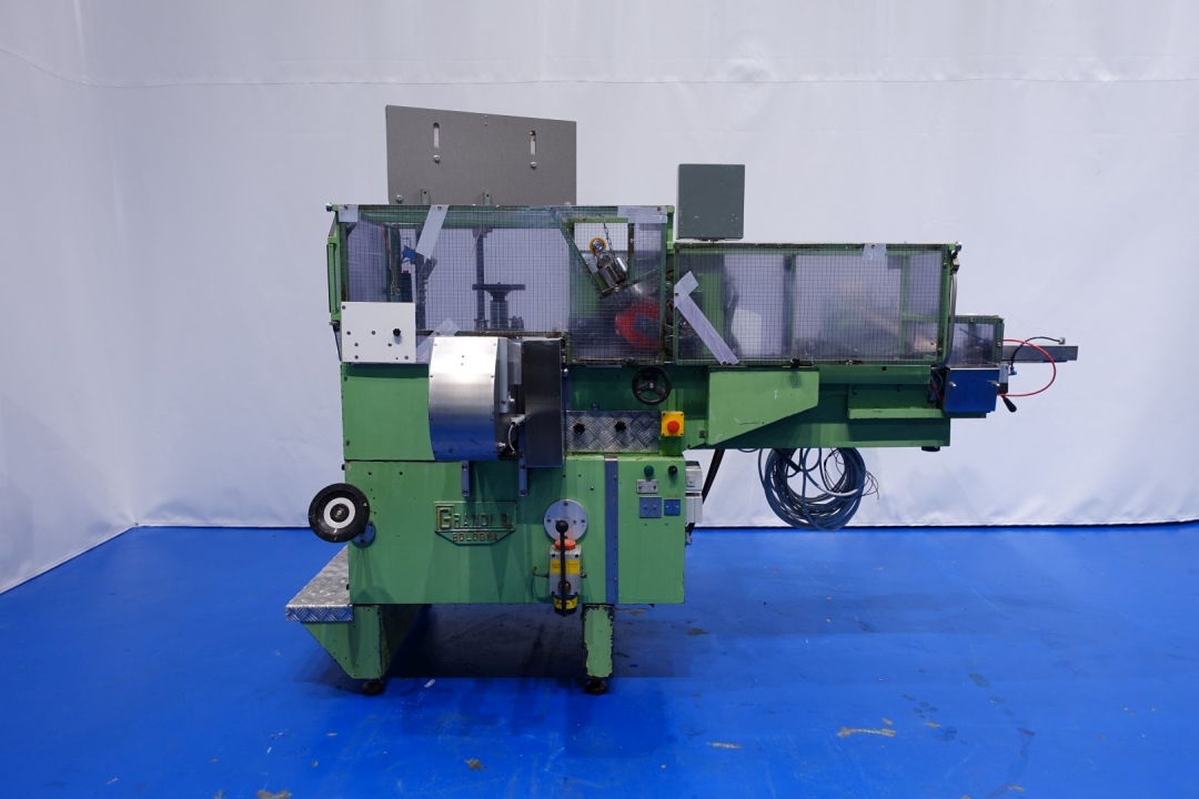 Miniseal-bander/for 'red'tear wire for round cartons of the 8/8 carton box portions (normally placed after a Corazza or Kustner triangle portion filling machine). The boxes are fed in through a toothed chain. During the seal-banding operation, the box is taken by two plates which obliges it to rotate. The seal-banding group applies the glue, the seal-band and the tear strip perfectly in the centre. Unique Grandi design. Total dimensions: 270x220x200 (lxwxh) cm - weight: 1.111 kg's. Labelling can be added (not in current configuration).