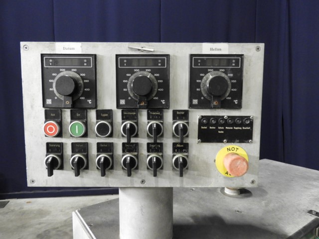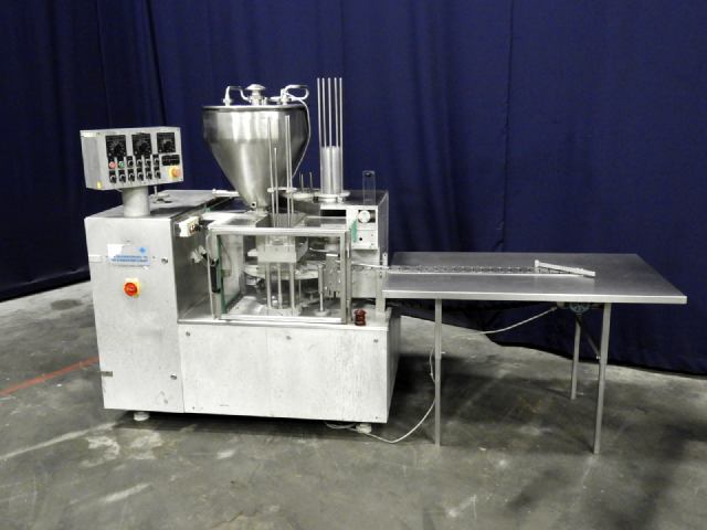 Rotary cup filling and sealing machine with 1 piston filling head. 10-Steps. Cup size round: 95 mm. Stations: cup destacking, piston main doser for viscose products with double jacketed hopper with spraybowls for cleaning without agitator, dispending by vacuum of preformed seals, heat sealing, snap cap cover station and outfeed conveyor with packing table. Manual packaging in tray. Control panel with relay controls. Machine enclosed with plexiglass guards.