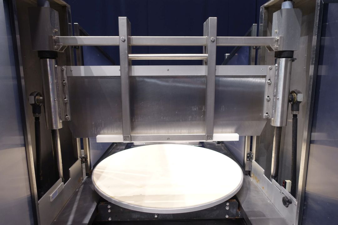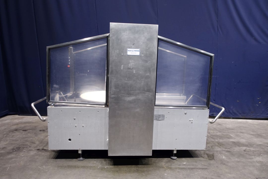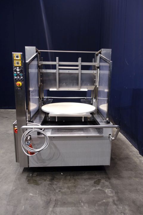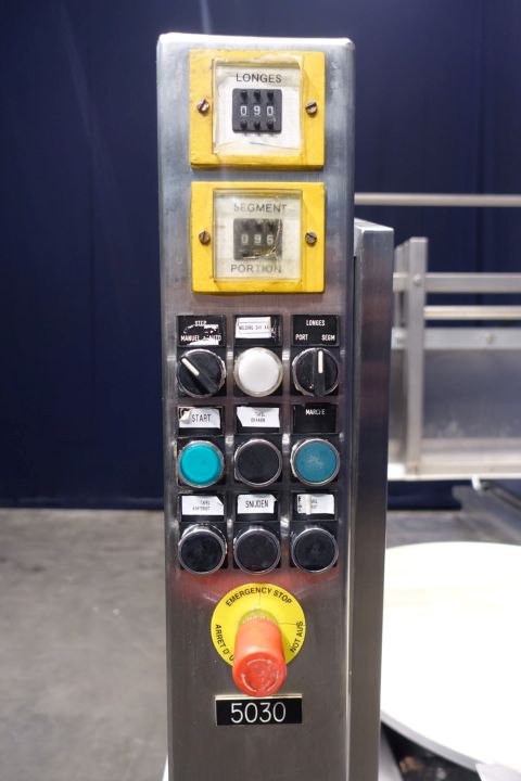 Cheese cutting/dividing machine. Cutting of round cheese. Turnable with cutting edge tilt mechanism (optimised cutting), easy to clean. Cutting of triangle segments, portions. Rond cheese loaves max dimensions (Ø, H): 950 mm, 280 mm. Modicon TSX Micro controls. Dimensions 372 x 155 x 191 cm.