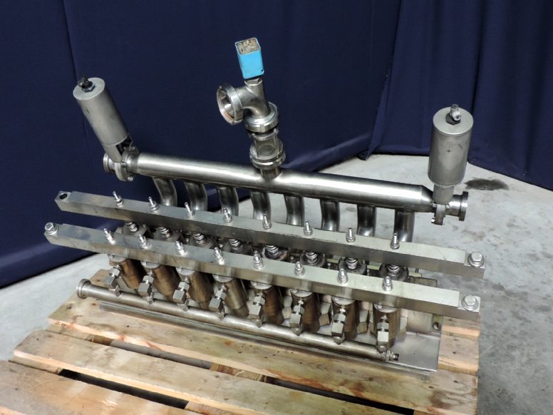 Main doser, 8-head, previously used on a Hamba 8-line cup filling machine. Volume of dosing per stroke: 200-500 ml. Heart-heart distance between nozzles: 100,1mm (4"). Negative filling nozzle. Total dimensions (L x w x H): 112 x 51 x 80cm.