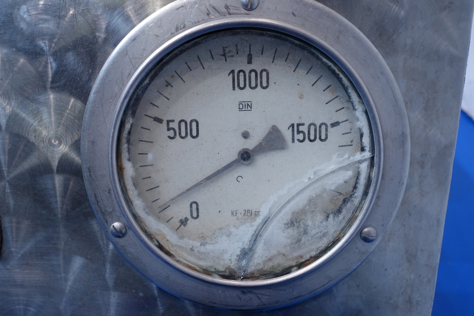 Pressing and moulding system for Big Round Cheeses. In this unit the curd is filled, in the moulds, drained and pressed. Used for production of Emmental cheeses Cylindric round model diameter 75cm. The entire press can be rotated to take out the cheeses. Suitable for 6 cheeses, with pressing cilinders, each with a cover which can be placed in a locked position. Each cilinder has a control button with 3 positions: pressing (up), neutral and release (down). Inner dimension of Cylindric press-mould: diameter 75cm Total height of mould: 32 cm after pressing up to 20cm weight per cheese: 60/85kg. Connections: 1 x 2" Din - 1 x 2,5" Din and 1 x 3" Din. Worked previously as a set with stocknumber 15793, including filling system and framework. Moulds (stocknumber 15762). Total dimensions: 610x110x122 (lxwxh) cm. - weight: 1.380 kg.