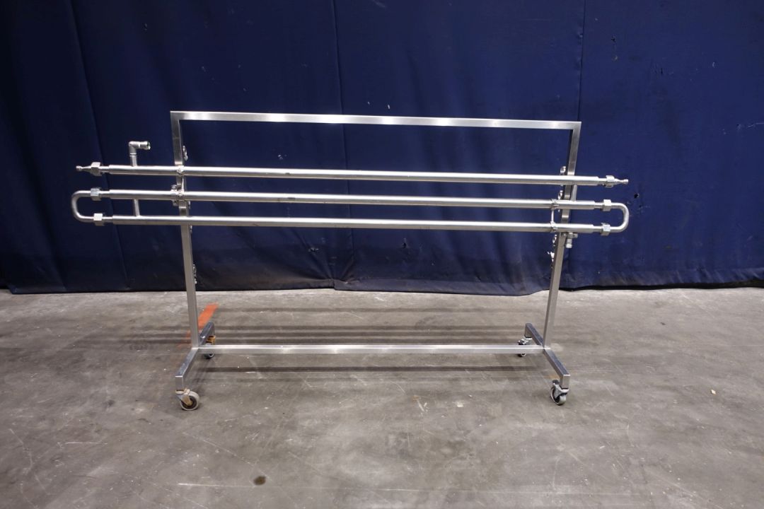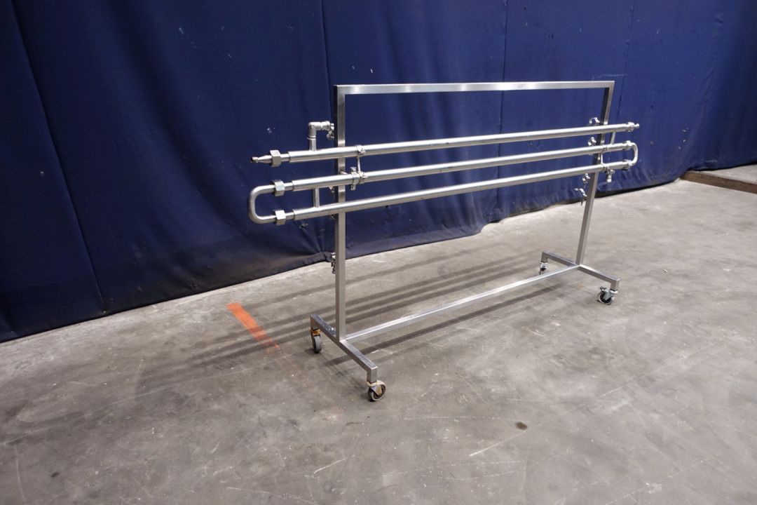 Tubular heat exchanger, sanitary (THE). Monotube, 1 compartments, Straight design, 3 tubes, 1 section. Length inner tube: 200 cm, length outer tube 180 cm. Outer diameter 38 mm, inner diameter: 22,5 mm. Connections: product: 1" SMS, Service: 16 mm SMS (measured inside). Including bends, on stainless steel mobile frame. static mixer - by swirl shapped inner part, 5 pieces - 2x1mtr per tube so 1 missing. Total dimensions: 225 x 50 x 116 cm. Weigth: 30 kg's. Designed for viscose products mixing and heating.