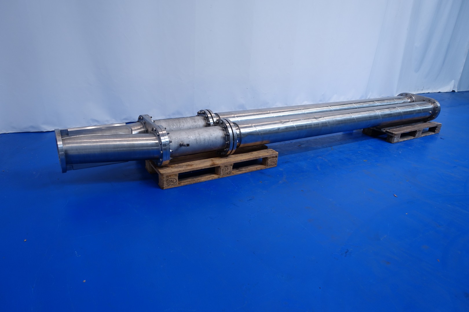 Resting tube, with filter, double resting tube in parallel for stand still during crystalisation on infeed of a wrapper. Double jacketed. With throuser piece on outlet, switch valve on inlet can be offered on request. Volume per tube ± 150 ltr total 300ltr + 30ltr in/outfeed piece. With 2x filter flange: holes 2mm. Inner tube diameter 20,5 cm - outer flange diameter 34 cm - length total 500 cm. Connections input side: 2x RJT 2". Total dimensions: 500x70x50 (lxwxh) cm - weight: 595 kg.