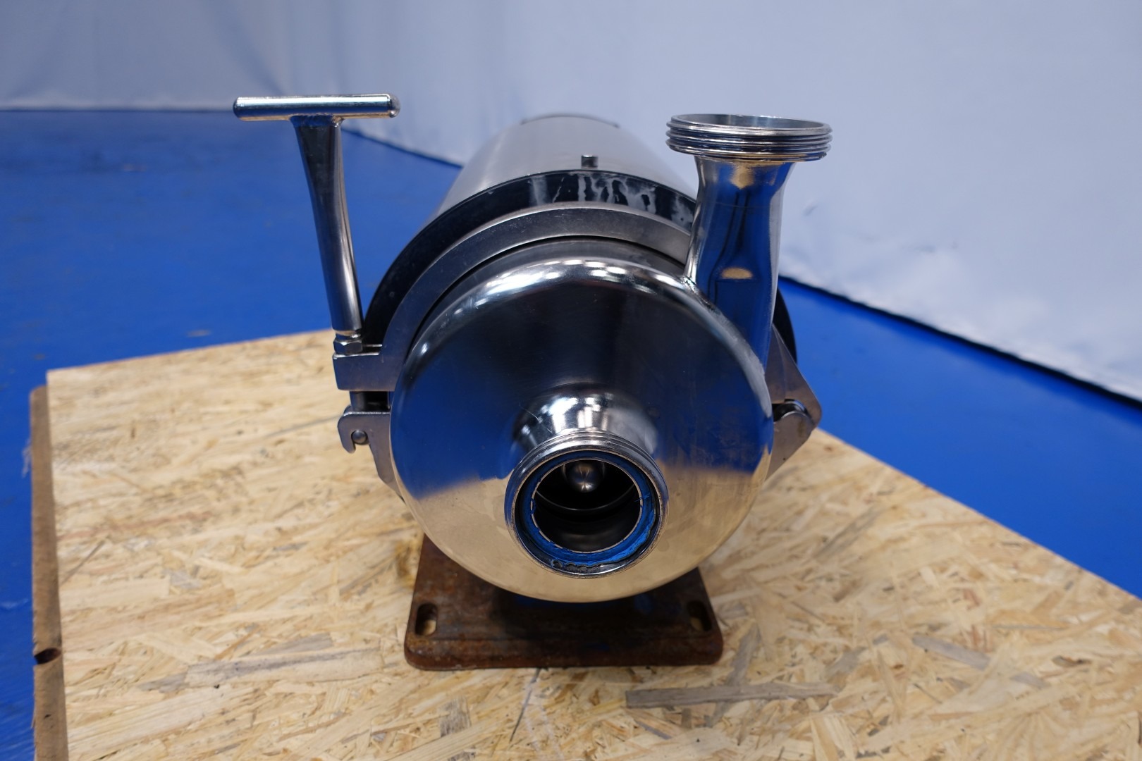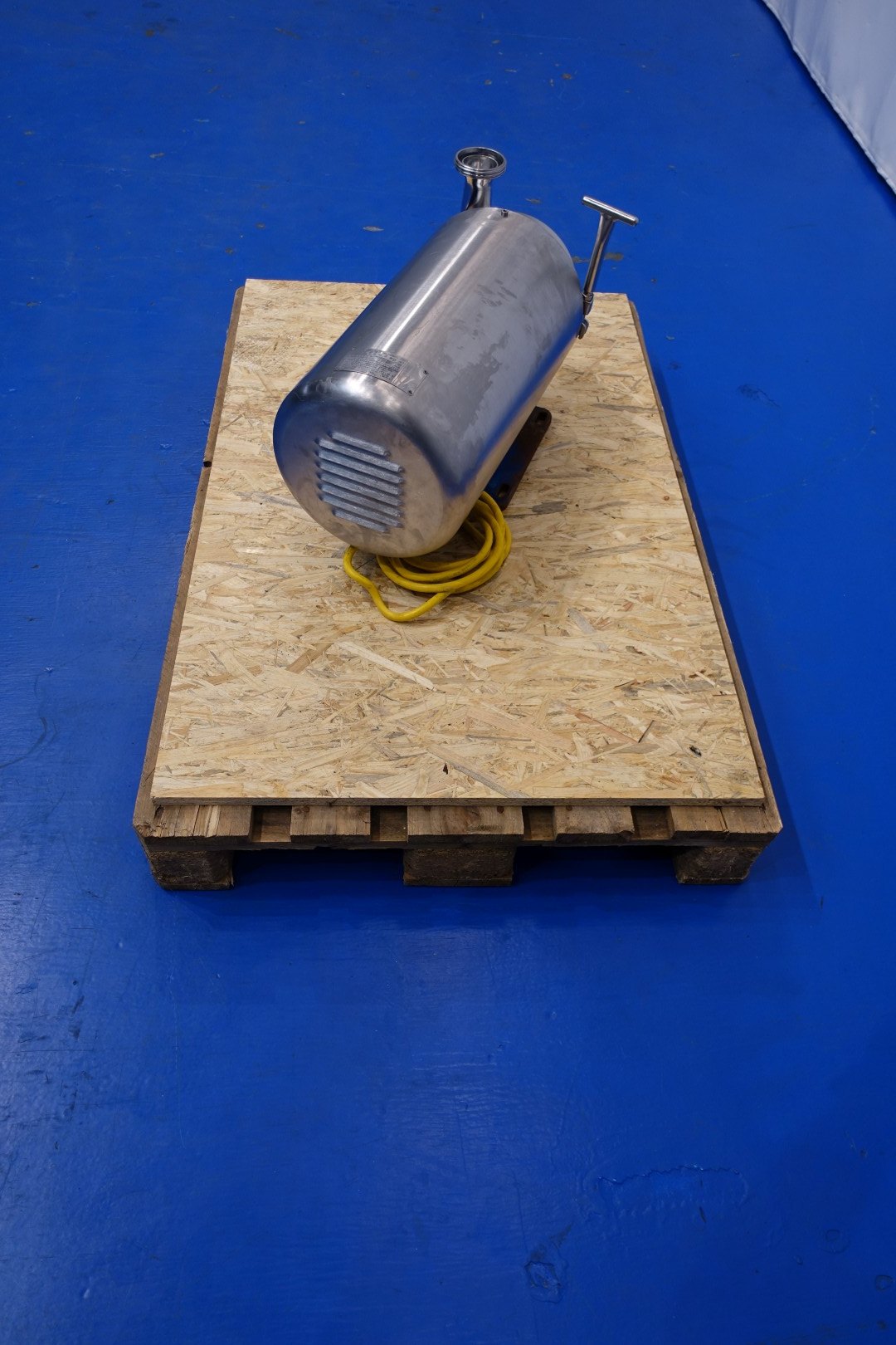Sanitary centrifugal pump. Current motor: 4,0 kW - 7,9 A - 50 Hz - 2.895 rpm. Impellor diameter: 160 mm. Connections: (In) 2,5" Din / (Out) 2,5" Din. In working condition. Total dimensions: 63x28x38 (lxwxh) cm - weight: 85 kg.