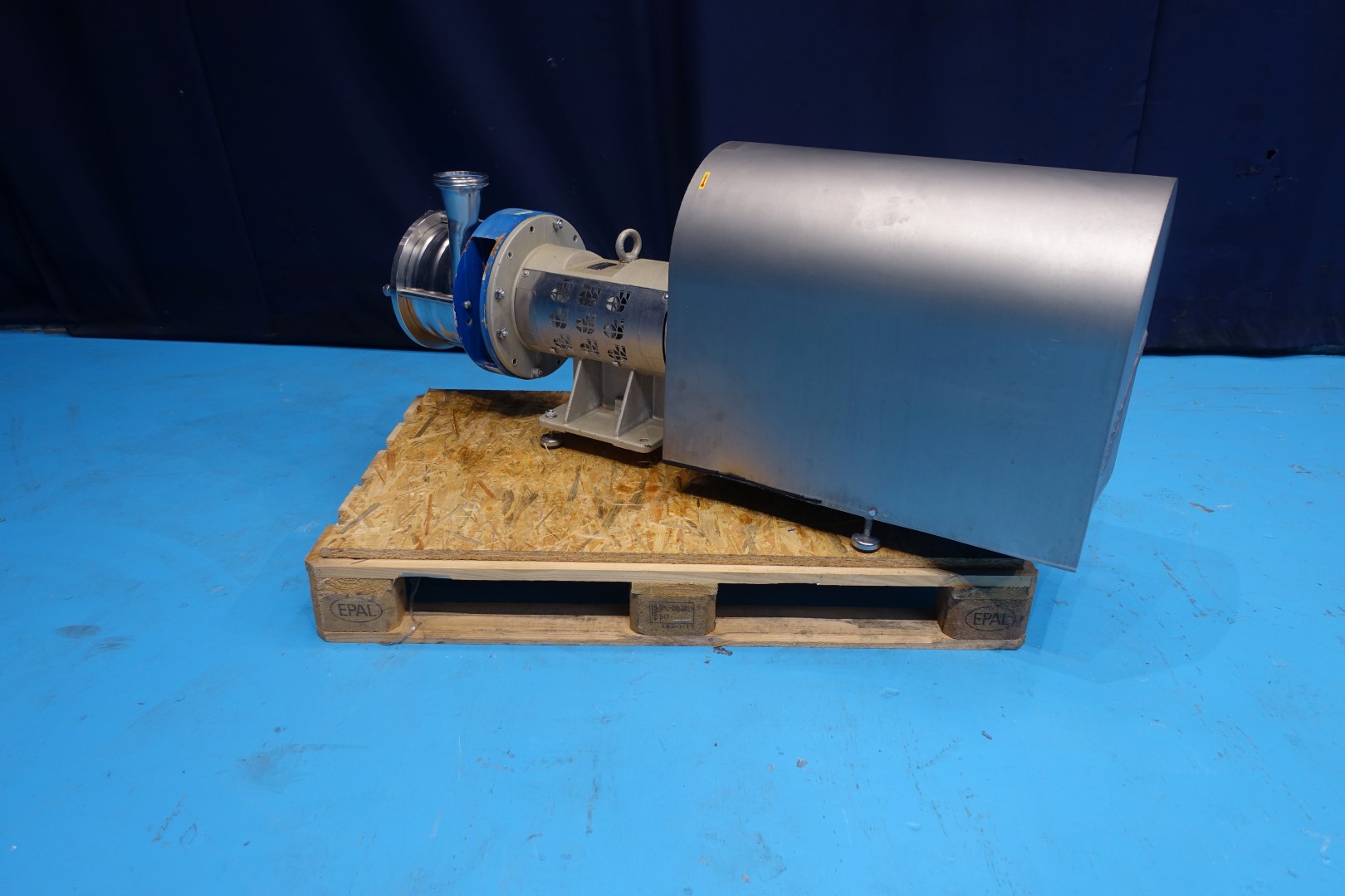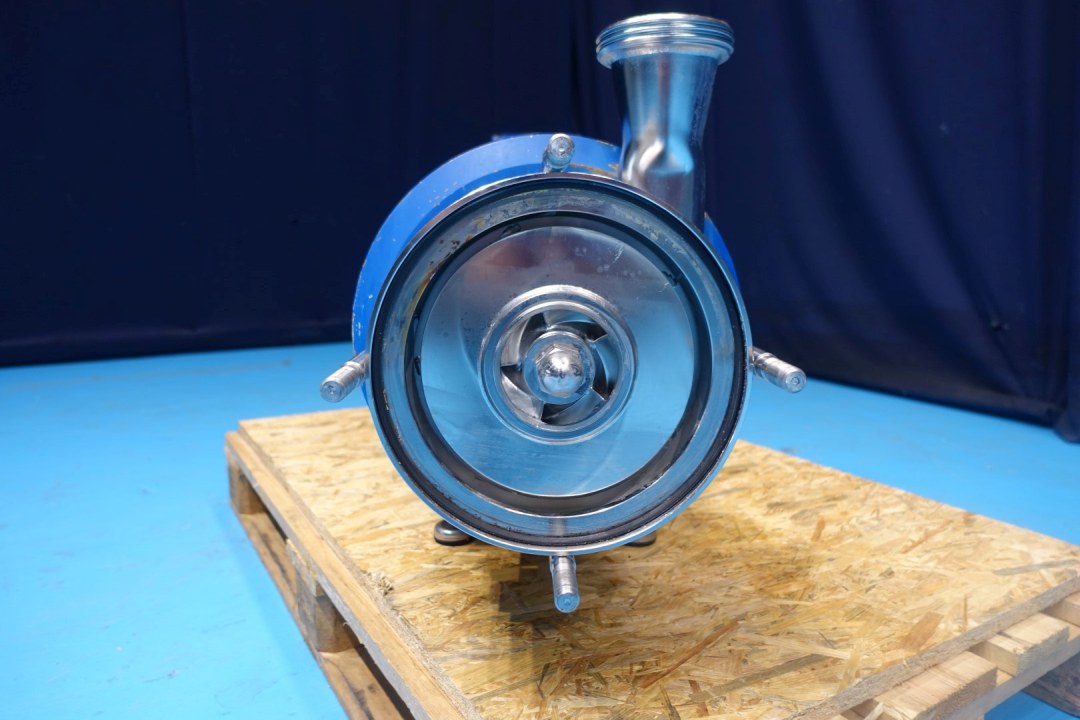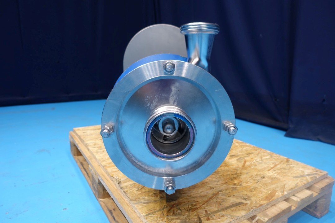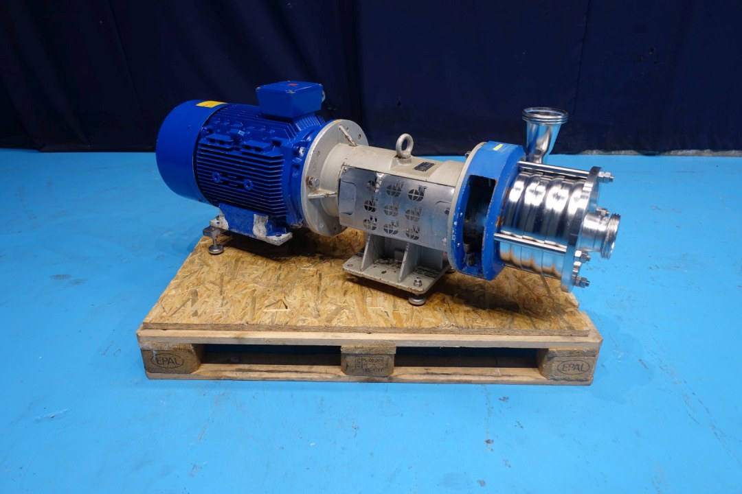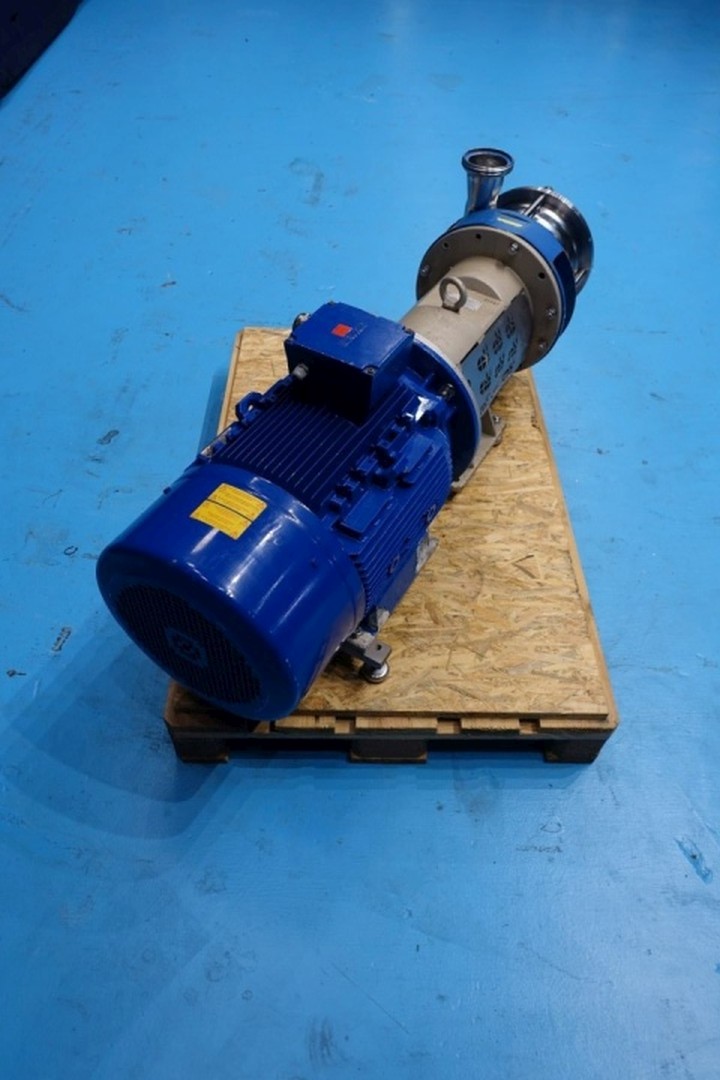 Sanitary centrifugal pump. Current motor: 22,0 kW - 38,5 A - 50Hz - 2.945 rpm. 3 Stages, high pressure. Pressure: 8 bar. Flushed seal. Connections: DN80/DN80 DIN. Total dimensions: 150x40x54 (lxwxh) cm - weight: 326 kg.