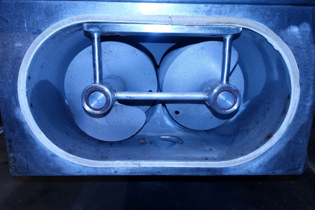 Mobile open butter buffer tank (butter silo) with cover. 2 Augers with 1 motor with mechanical reductor, motor 3 kW - n1: 1410 rpm - n2 (speed augers) 5,8 - 29 rpm (mechanical reductor). Cover pneumatic tiltable and with sight glass. CIP cleanable by 2 spray bowls in lid. 2x round flange connections for 2x butter pumps (including 2 butterpumps make: Pasilace with plastic impellors, motor 2,2 kW). Excluding controls. Total outside dimensions: 390 x 260 x 230 cm.