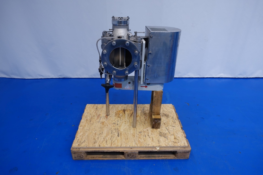 "Dosing, dissolving and mixing set for automatic dissolving of powders 3 powders in a liquid. Originally used for whey powder, vitamins, and sugar. Whey powder and sugar dosing by means of powder lock and dosing screw, vitamins with a small dosing screw. The powders come together with the liquid in the special mixing head. The liquid can be preheated by a plate exchanger to the desired dissolving temperature. Material: 1) Powder funnel / separator Aso tpe KPL. A22 with vibratory motor type: AAS 0.5 Gr.2 2) Powder lock 3) 2 Dosing worms, Double worm under a funnel type Azodos P30/2 4) Dispergator with flush seal, 15kW, 3,000rpm, butterfly valve on inlet, by-pass valve for cleaning. 5) Product heater with plate heat exchanger (Tetra Clip8-RH, bj2000), 1 section and hot water set used on outlet from 45->73°C, 7,000ltr/hour but can also be used on inlet to heat product to complete with hot water set, water circulation pump (KSB), steam control valve, stainless steel expansion vessel and heat exchanger steam/hot water (Tetra CB). Excluding: Pump on outgoing product, by-pass valve. (are crossed out on P&ID)."