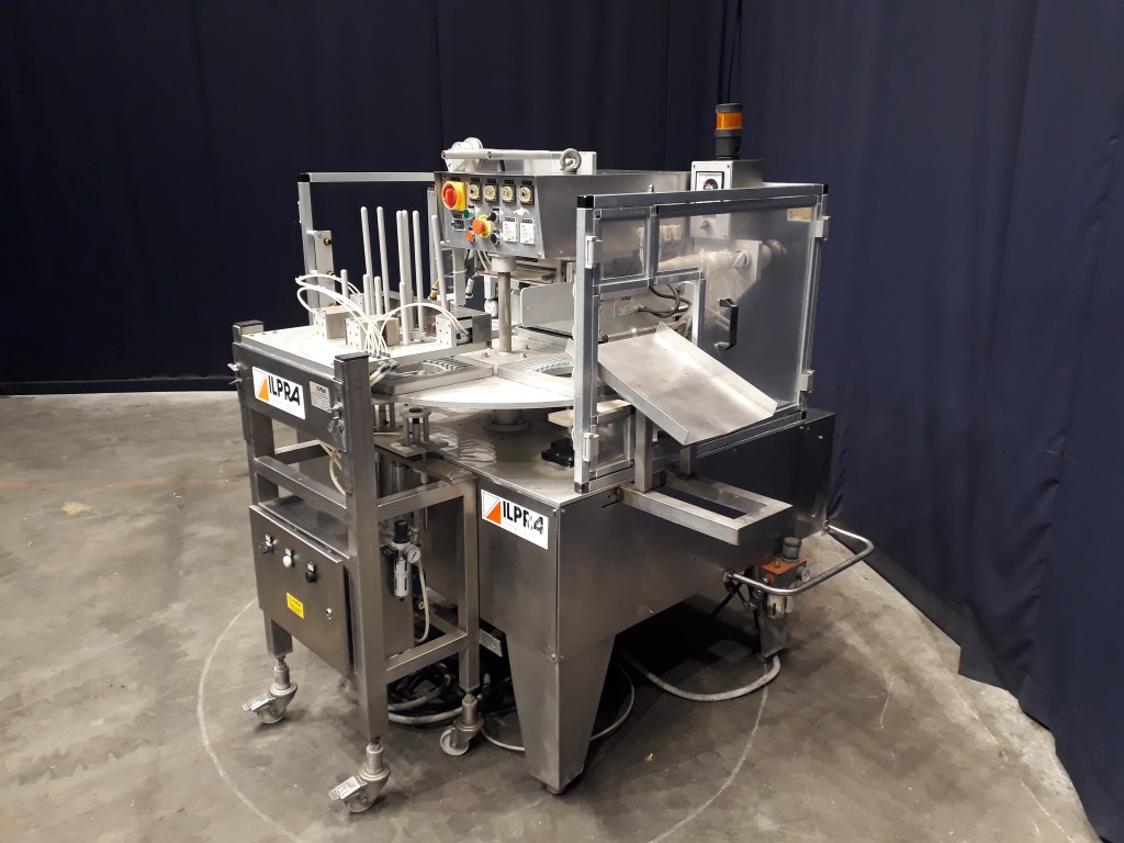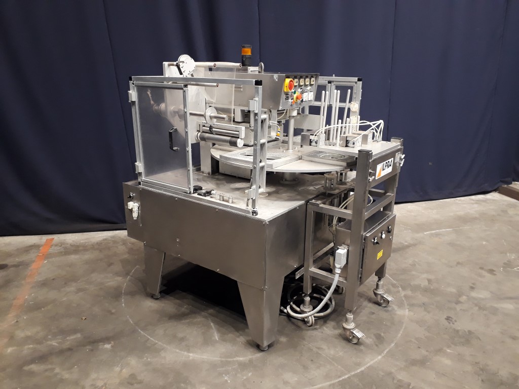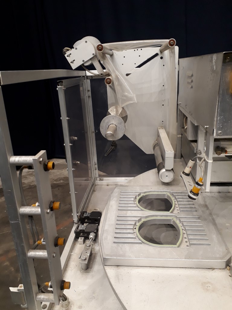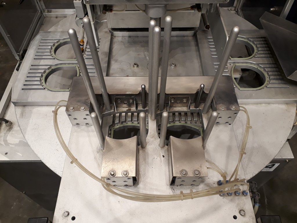 2-Head destacking and sealing machine with vacuum and gas. 2 cups in 1 set. Dimensions cup: 13,2 x 13,5 cm. With automatic cup infeed system. With higher vacuum, capacity goes down. Possible to add an 2 head piston doser on the machine. Total dimensions: 170 x 170 x 175 cm.