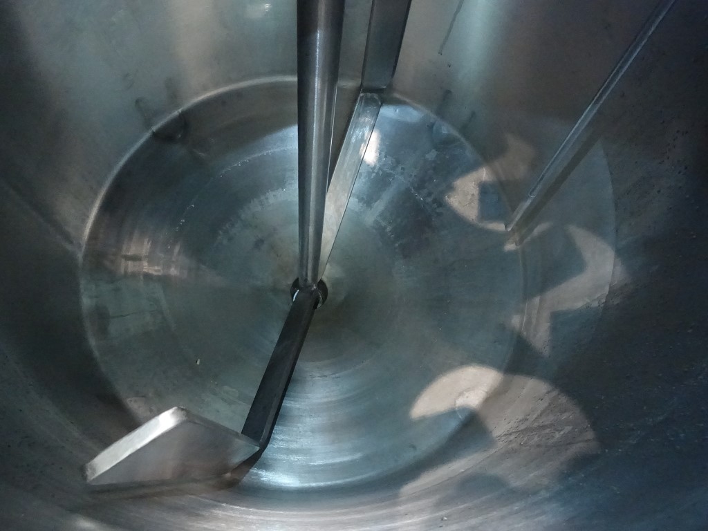 Insulated tank with 'U' shaped agitator - 0,75 kW - 28 rpm - 2,2 A. Flat to the side, product Outlet DIN. With pneumatic valve on top, pneumatic bottom valve, outlet height: ..cm. On top of the tank a pt-100 temp sensor, pressure transmitter, high and low level, 2 cip spray bowls, manhole in top round diameter 19,5 cm. 4 Feet with 4 loadcells, Mettler Toledo weighing system type 0958. Innner dimensions of tank diameter 70 cm, cylindrical height 75 cm, cylindrical and concial height 90 cm. Outer dimensions lxwxh: 97 x 72 x 223 cm.
