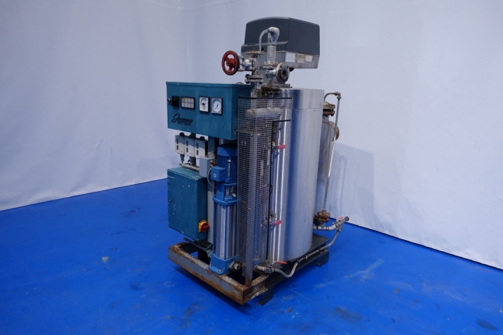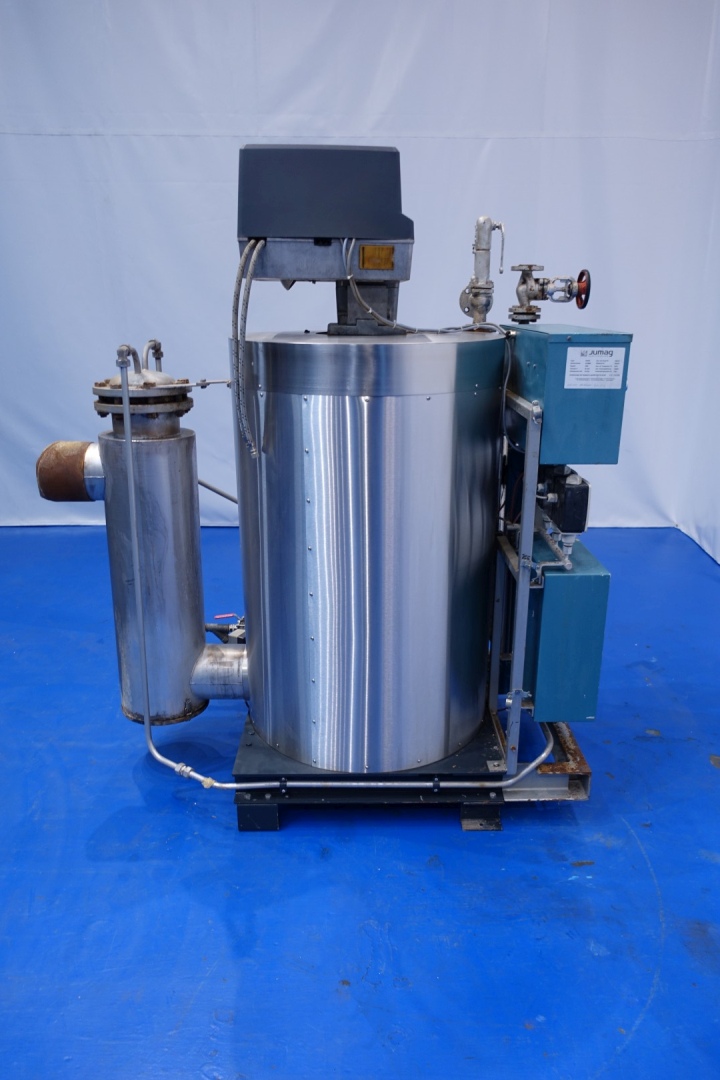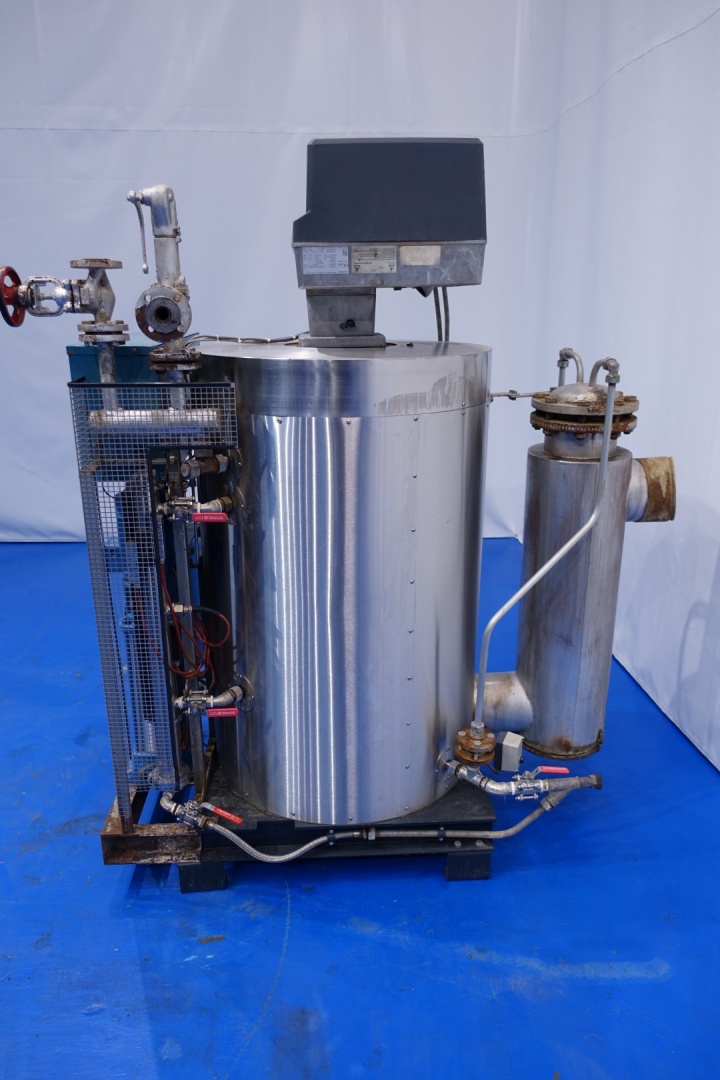 Steam generator - oil fired. Compact quick steam boiler. Volume 45L - max operating pressure: 13 bar - steam output up to 320 kg/h - heat output max 218 kW - working pressure 6-11 bar - heating time approx 8 min. With Grundfoss waterpump and Weishaupt WL30Z-C burner (capacity min 72 - max 330 kW). Total dimensions: 170x83x188 (lxwxh) - weight: 693 kg.