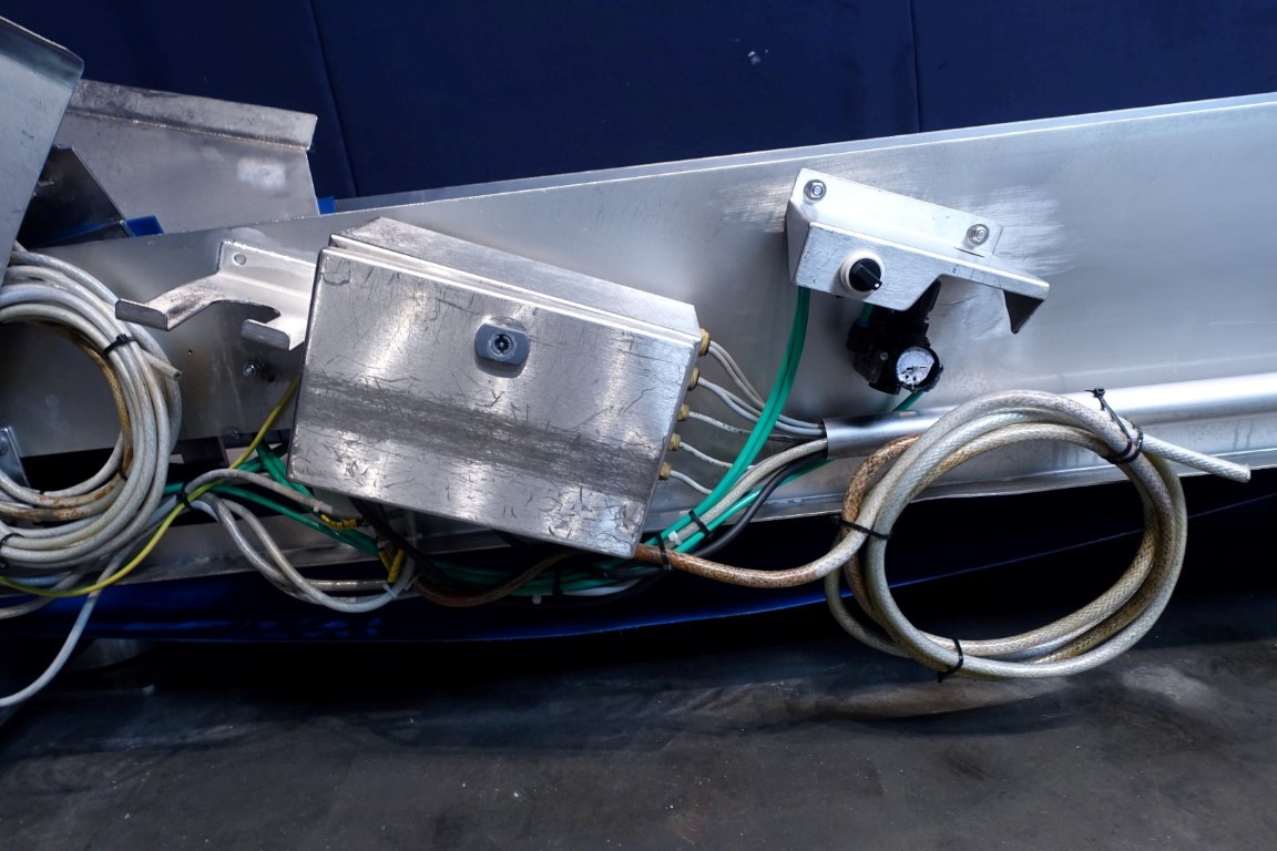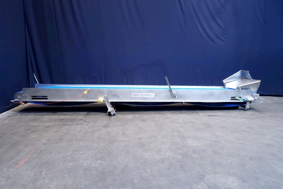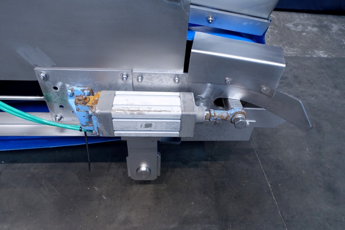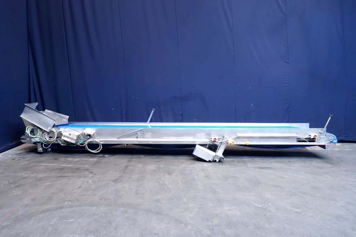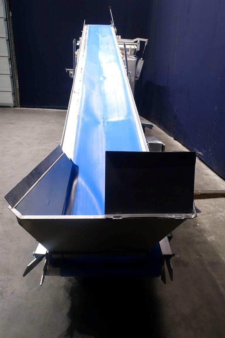 Belt conveyor. Effective belt dimensions: 660 x 56 cm. Drum motor: 1,5 kW. Belt under angle going up. Total dimensions: 670 x 120 x 100 cm. Weight: 670 kg. Will be sold together with STN11950 (Ribbon blender). Last photo is of both together.