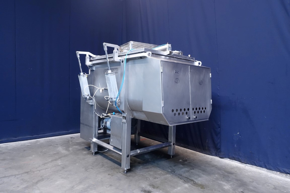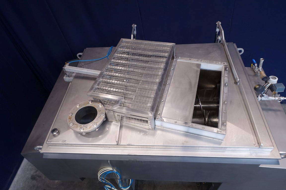 Ribbon blender with 2 axles. Horizontal. Single jacketed. Manual cleanable. Outlet slides, pneumatic controlled. Closed cover with an ingredient inlet, manual. Cover pneumatic tiltable. Motor: 6/7,5 kW - 11,4/15 Amp - 39/78 rpm. Motors already reconditioned. Dimensions product room: 170 x 130 x 120 cm. Total outside dimensions 280 x 170 x 280 cm. Total weight: 2.270 kg. Will be sold together with STN11948 (Infeed conveyor). Last photo is of both together.