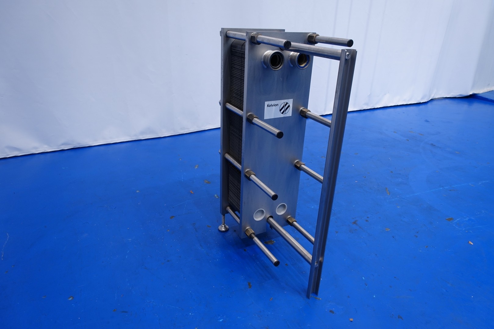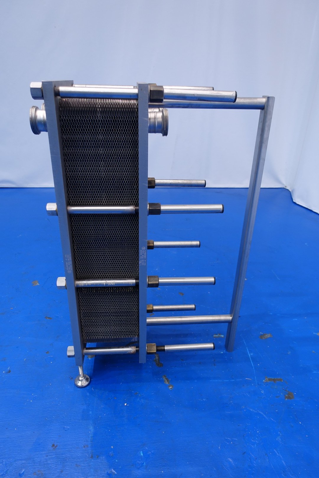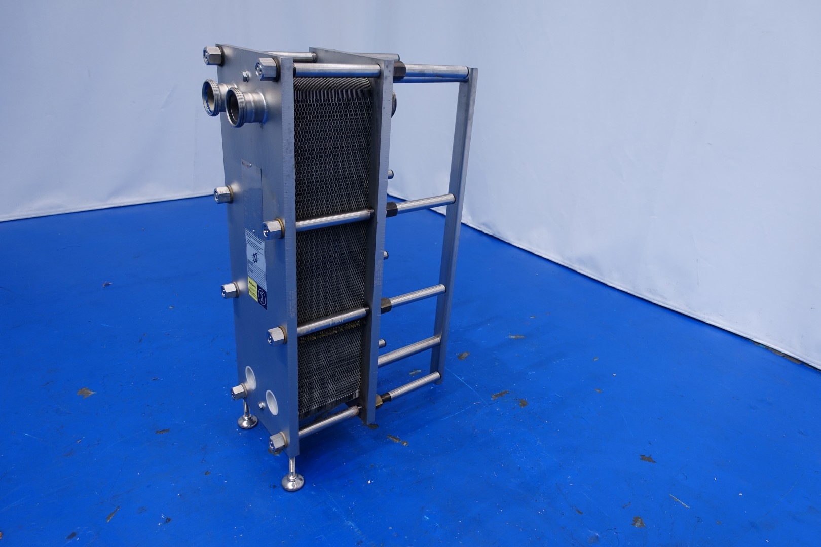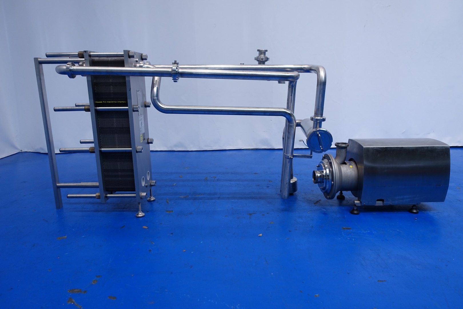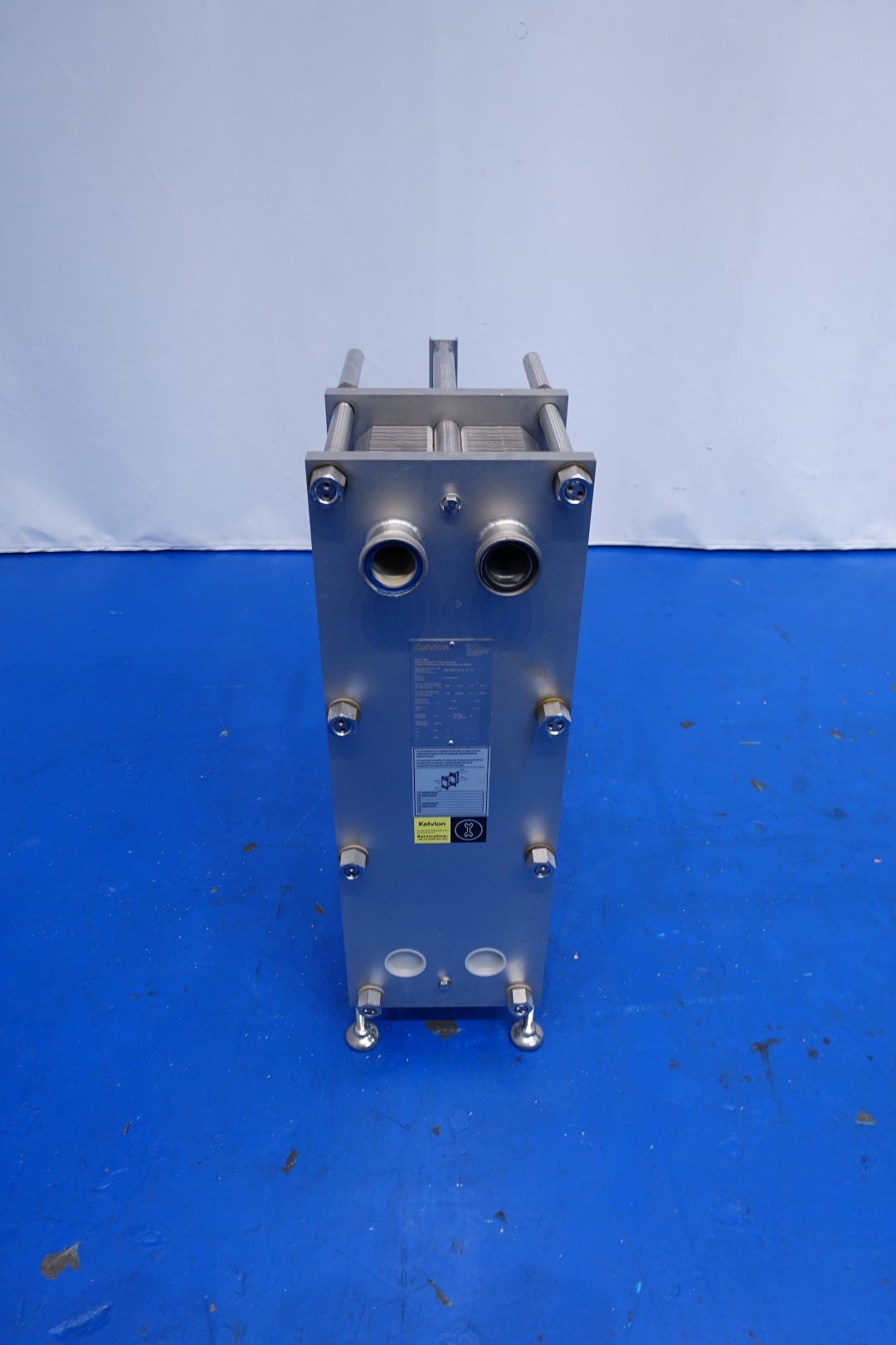Plate heat exchanger, sanitary (PHE). Pressure: 10 bar. Beam length: 60 cm, connections: 4x 2,5" Din. Current configuration: 1 Section: 65 plates - Connections head: 2 up - follower 2 up. Also in combination available with KPA self suction liquid ring pump (STN15808) piping and filter as reception unit. Total dimensions: 72x33x107 (lxwxh) cm - weight: 211 kg.