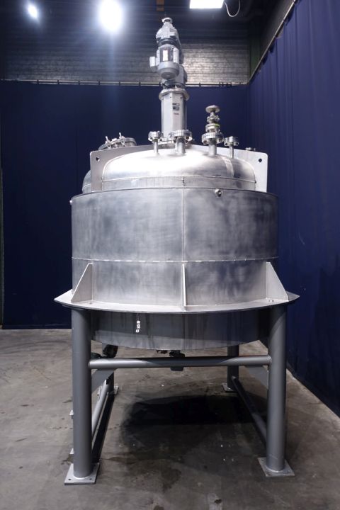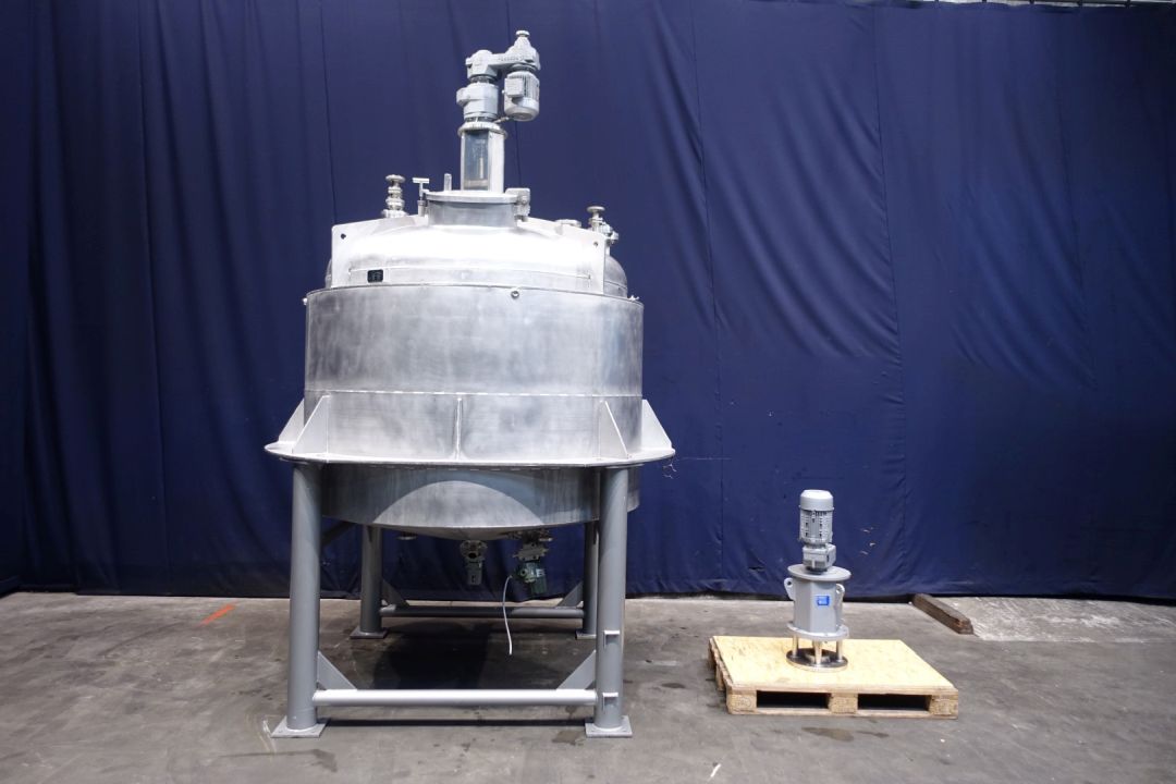 Double jacketed process tank, not insulated. Top side driven fence agitator (slow rpm), positioned in the middle. Motor power: 1,1 kW - 3,5 A, reductor with manual variable speed reducer to 3,4-29rpm. And top side driven propellor agitator (fast rpm), positioned off center, currently with no shaft/agitator. Motor (make Nord) power: 1,1 kW - 2,68 A - n1: 1.400 rpm - i 17,21 - n2: 81 rpm. Jacket volume: 280 ltr - pressure in jacket: 1,9kg/cm2 temperature 80°C. Product outlet 2" Try clamp and outlet height: 72 cm. Including pneumatic butterfly on outlet. 1 x Pressure transmitter-sensor in bottom. 1 x Temperature transmitter-sensor in bottom. 2 CIP spray bowls. Manhole in top rectangular 45x32 cm. On steel frame with 4 Feet. Inside dimensions of tank: Ø170 cm and height 135 cm. Total dimensions: 190 x 190 x 370 (*with drivework) cm. Weigth: 1.950 kg's.