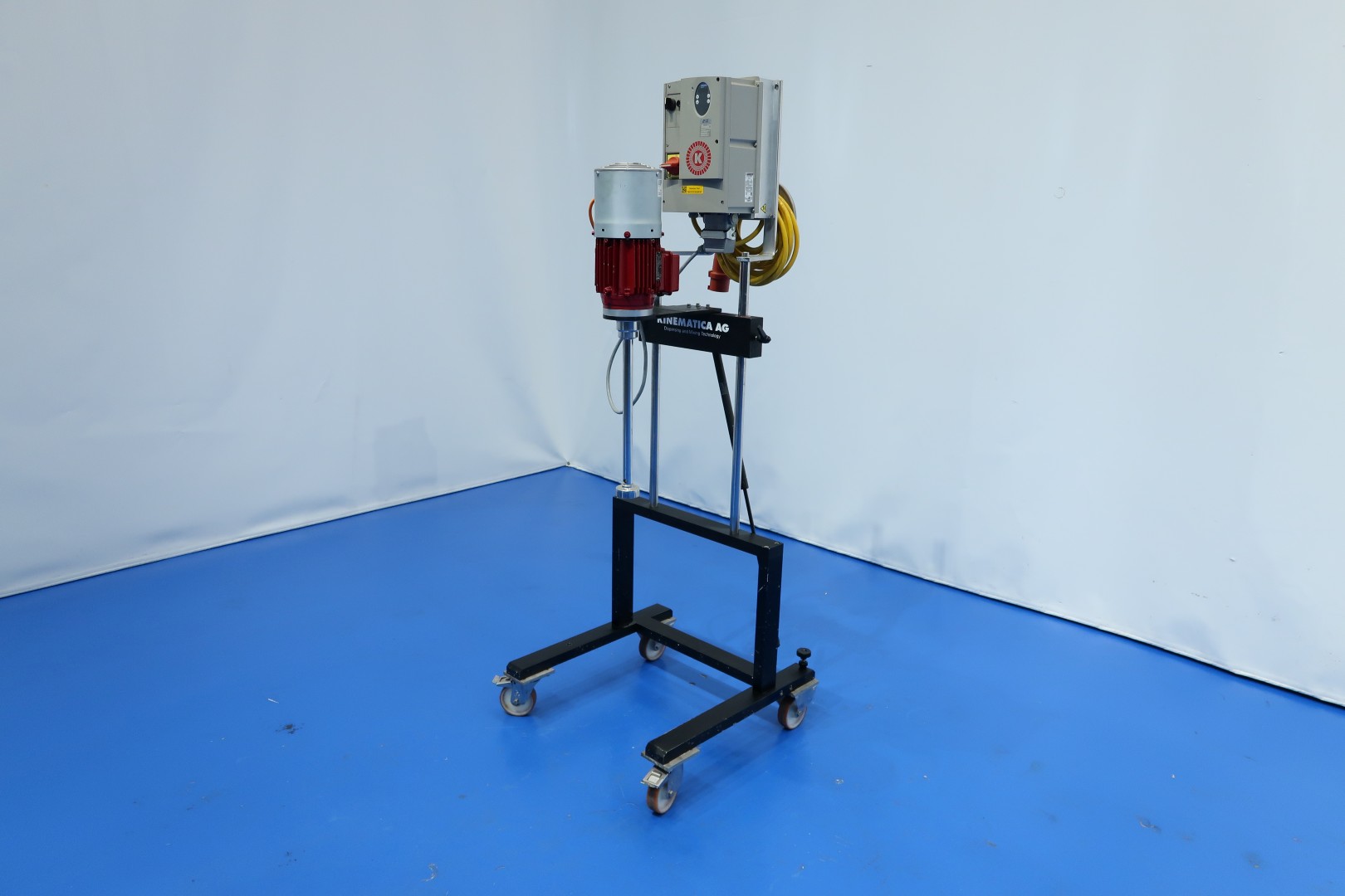High shear mixer on mobile tripod - high speed. Tripod height manually adjustable; lowest position: 25 cm - highest position: 70 cm (measuered below agitatorhead). Outer diameter mixing head 60 mm. Motor 3,0 kW - 5,4 A - 11.780 rpm. With forced cooling. Max working temperature 90 °C. Controls directly on machine with adjustable speed built on frequency convertor. Test video available. Total dimensions: 63x60x172 (lxwxh) cm - weight: 32 kg.