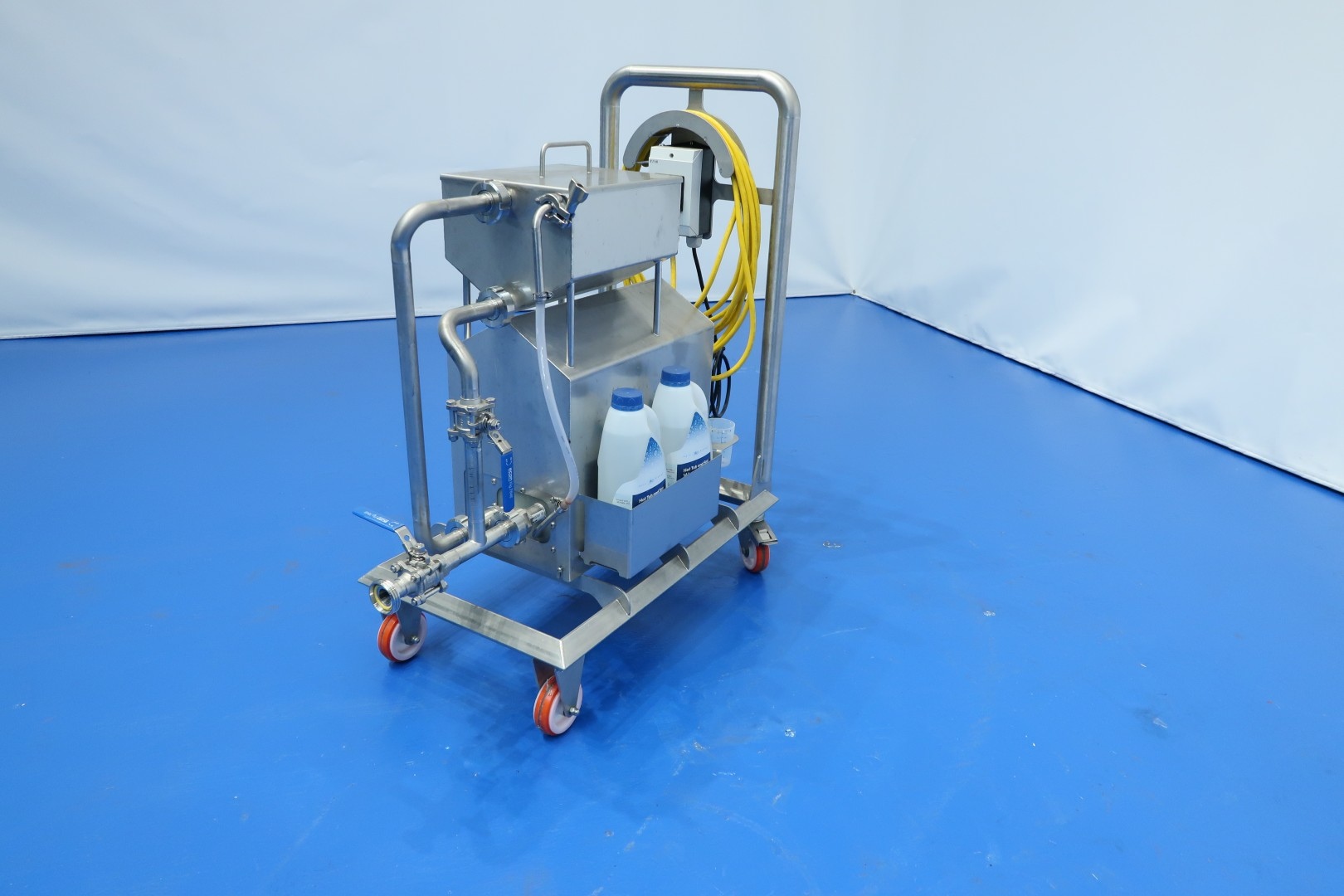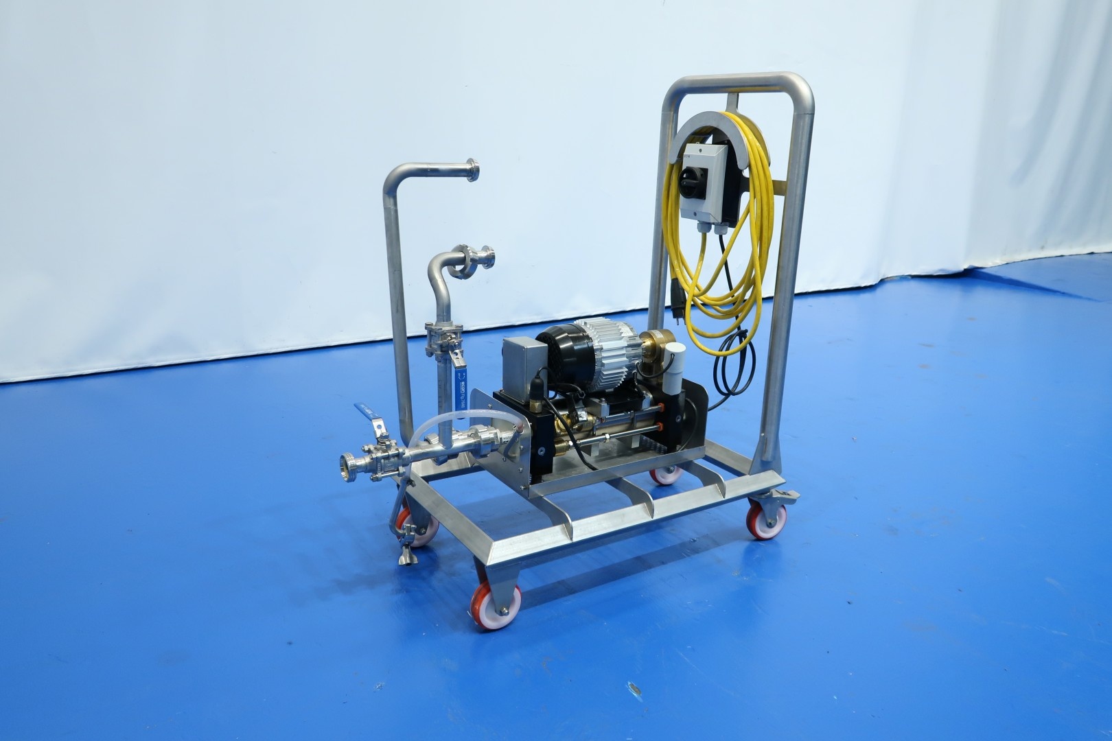 Laboratorium osmose waterpump unit on mobile SS frame. Pure demineralised water for final rinse phase to prevent risk of breakagees and transmission of bacteria. Max pressure: 7 bar - min pressure: 1 bar. Max temperature: 25 °C. Documentation available. Total dimensions: 75x45x100 (lxwxh) cm - weight: 65 kg.