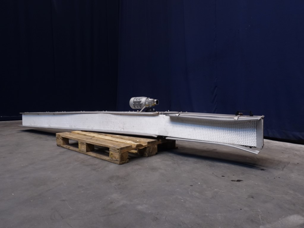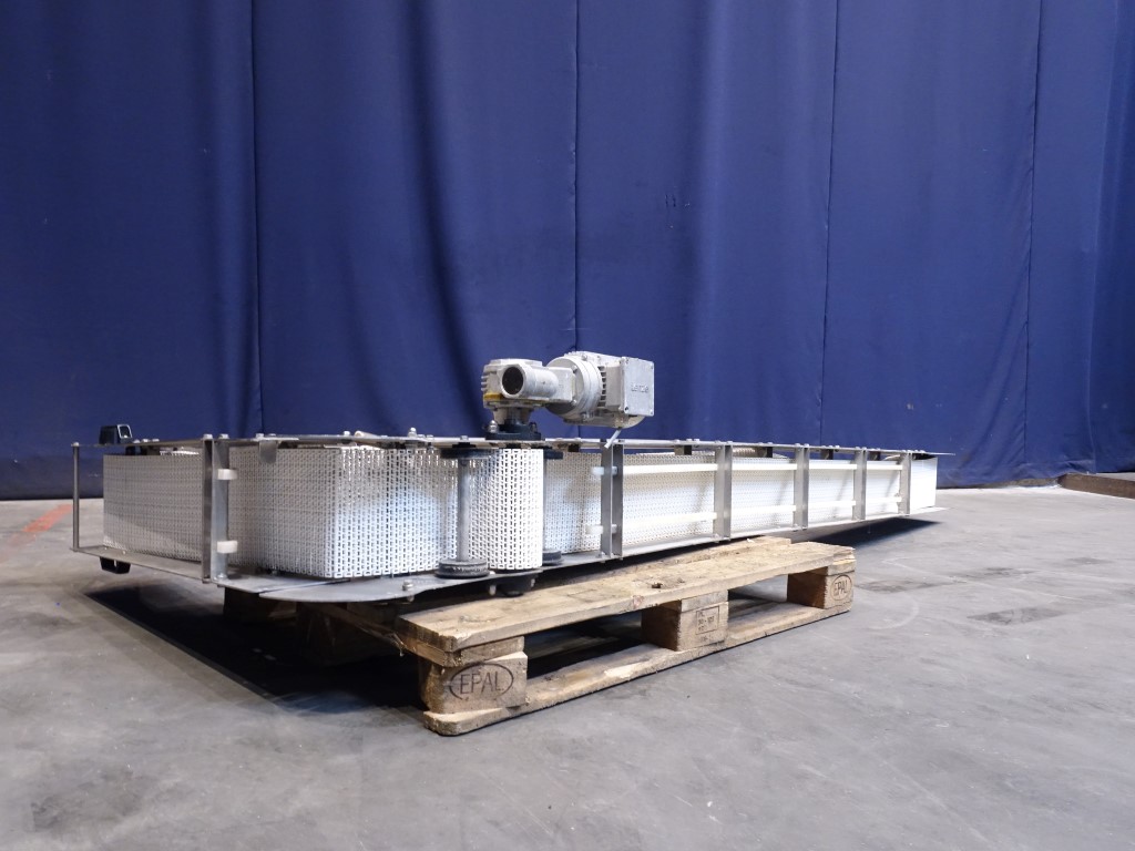 Chain conveyor. Effective belt: 20 x 390 cm. Motor details unknown, no typeshield. Possible to make a small carry up or down. Total dimensions: 400 x 40 x 150 cm.