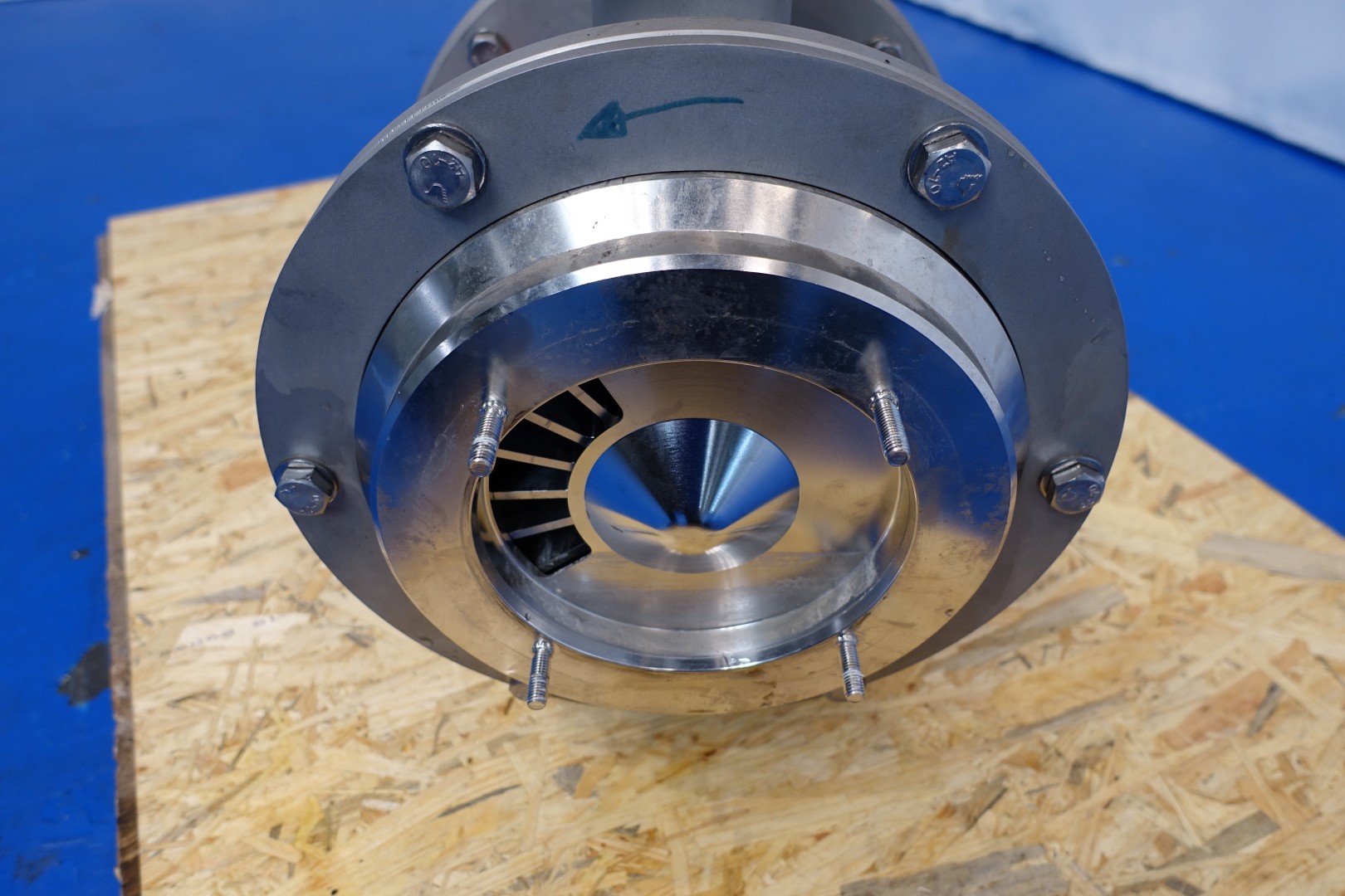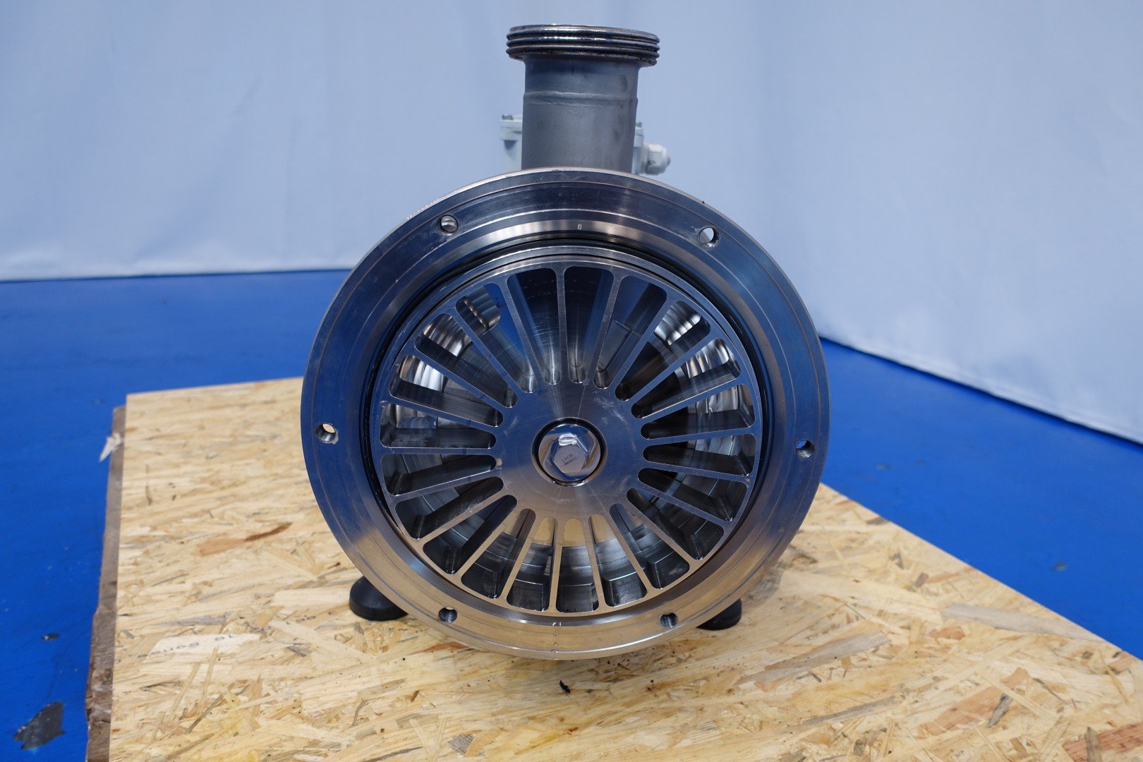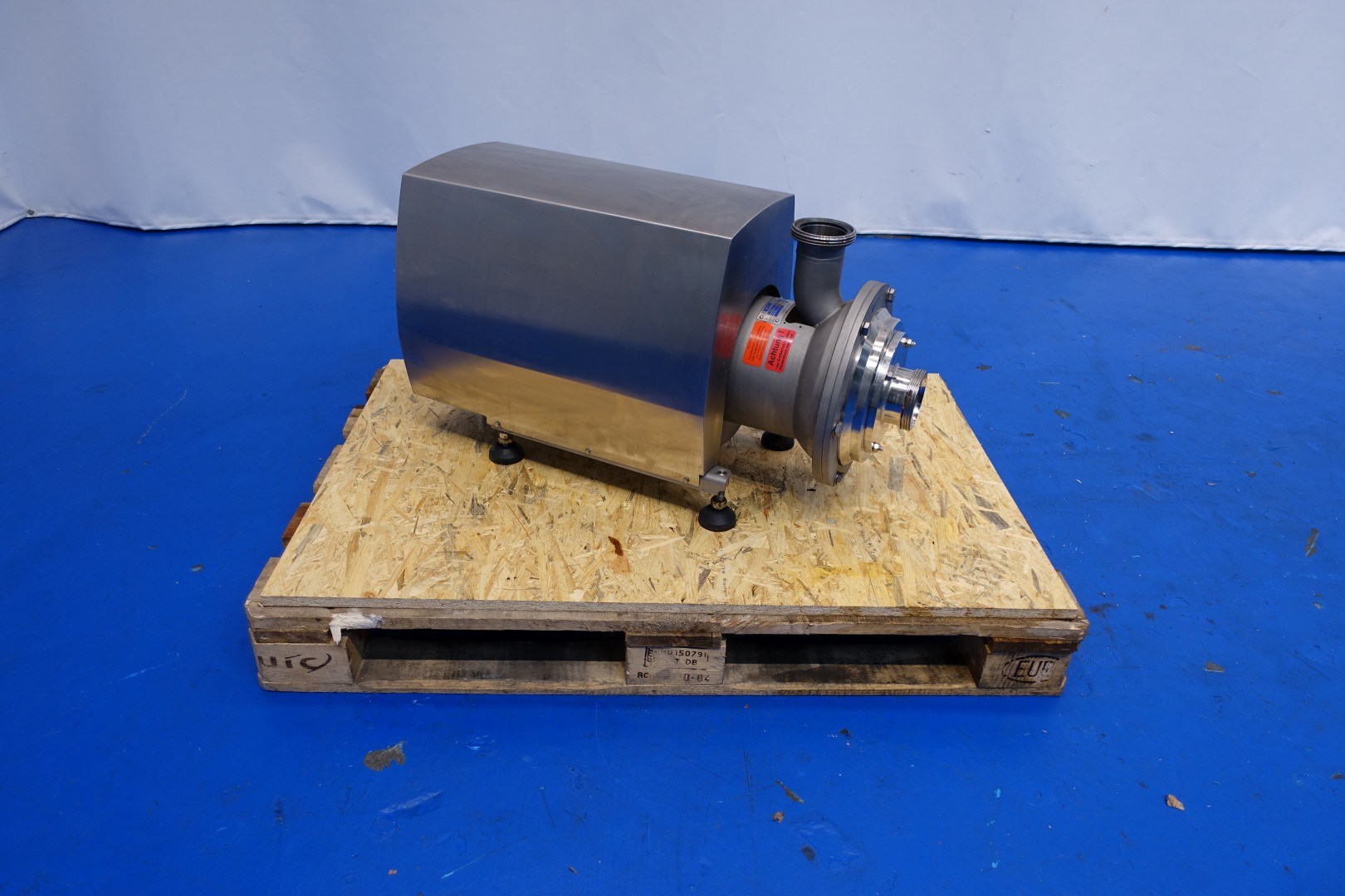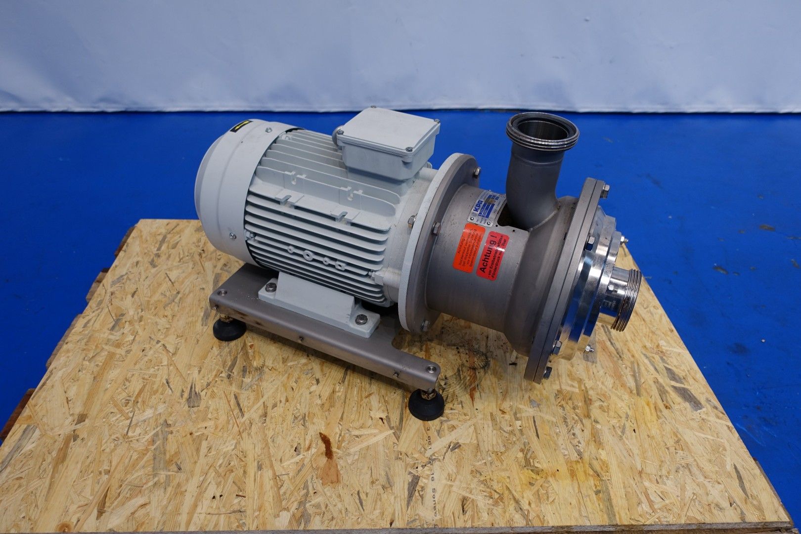 Sanitary self suction centrifugal liquid ring pump. Current motor: 7,5 kW - 15 A - 1.460 rpm - 50 Hz. Impellor diameter: 225 mm. Pressure: 2,5 bar. Connections: (In) DN80 Din - (Out) DN65 Din. Also in combination available with Kelvion plate heat exchanger (STN15760) piping and filter as reception unit. Total dimensions: 85x36x48 (lxwxh) - weight: 140 kg.