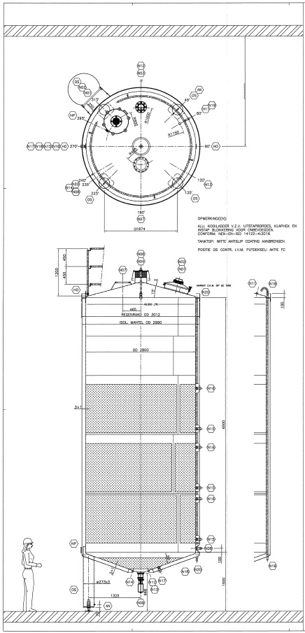 Vertical double jacketed insulated cream storage and cooling tank. Nominal volume: 40.000 liter. Design pressure: 0-0,49 bar (tank) and 4 bar (jacket). Design temperature: -10°C - 99°C (tank and jackets). Top side driven Jongia propellor agitator (centered), motor: 1,1 kW -speed: 29 rpm. Insulated, side and bottom. With 3 x cooling sections; 1 x bottom 3,6 m2 and 3 x side 10,7m2 (total 35,7 m2). Previously used for cream storage and cooling via glycol from 8°C -> 4°C in 4 hours. Product outlet pipes 2,5" with 2x pneumatic tank outlet valves. Outlet height ca. 71 cm. With cleanable sample valve. In botom 3 x sensor: temperature, pressure and level. In top level sensor, sightglass with lamp and breather. 4 CIP spray bowls (1 in top, 3 in side). Manhole in top, round Ø ca. 50 cm. 4 Adjustable feet. Inside dimensions of tank: Ø 265 cm and cylindrical heigth: 650 cm. With alu cage ladder mounted on side. Documentation inculding drawings available. Total dimensions: 295x295x920 cm - weight: 4.600 kg.