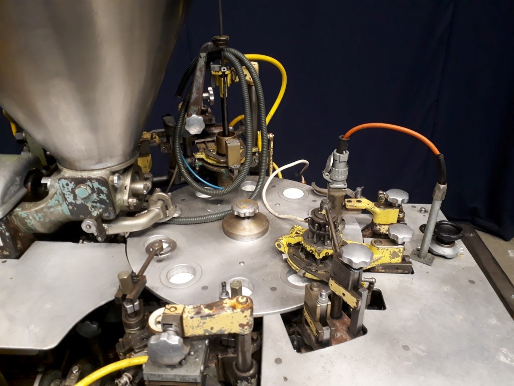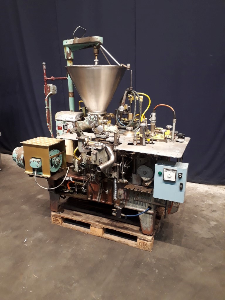 Automatic filling and wrapping machine for processed cheese or cream cheese. Liquid hot fill. 10 Step turn table.Current format: 50 gram, round 68 mm, height adjustable. Feeding by hopper with agitator. Bottom foil forming, filling with cut off valve, top foil cutting and placing on product, heat sealing and outfeed arm. Control panel. Incomplete unroaling device topfoil and dosing piston. Excluding outfeed conveyor. Total dimensions: 160 x 200 x 230 cm.
