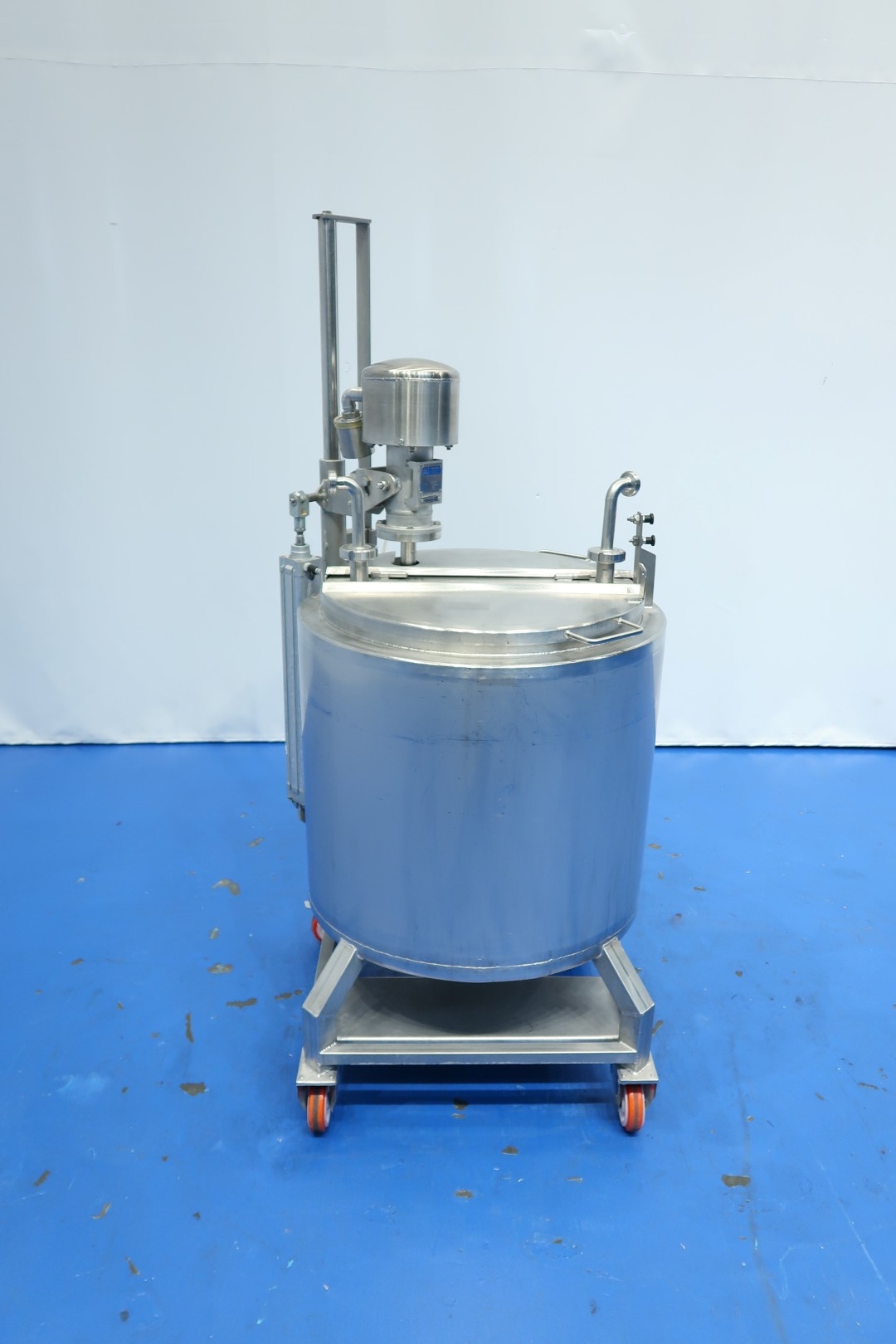 Double jacketed mix/process tank on mobile SS frame with lifting option. Jacket pressure: 5bar, volume 2,7 ltr and max temperature: 160 °C. Complete agitator can be lifted via an air cilinder. Jongia agitator motor driven by air. Manual operation via ball valve. Outlet manual buttefly valve, connection 3" Din. Testvideo available. Total dimensions: 105x90x183 (lxwxh) cm - weight: 248 kg.