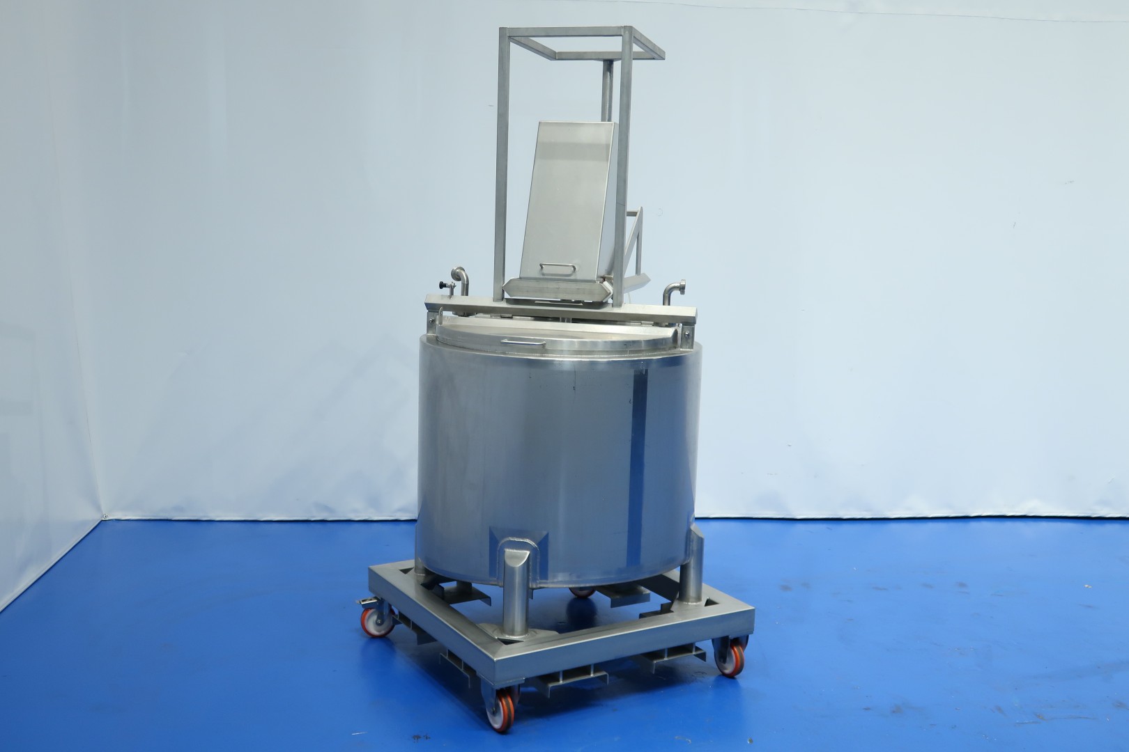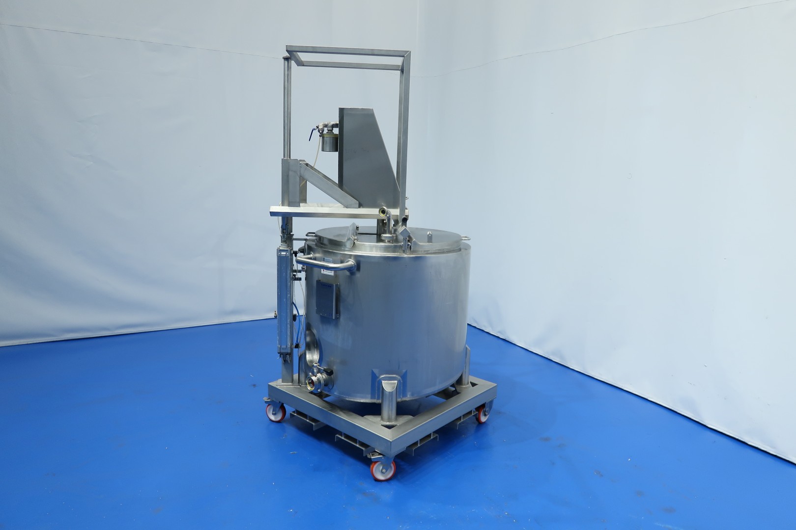 Double jacketed process tank on mobile SS frame. Top side driven agitator with 'cup' stirrer. Pressure jacket: 5 bar and volume: 1ltr. temperature: 160 °C. Complete agitator can be lifted via an air cilinder. Agitator motor driven by compressed air variable speed by manual ball valve operation. Outlet manual butterfly valve, connection 3" Din. Test video available. Total dimensions: 100x95x206 (lxwxh) cm - weight: 330 kg.