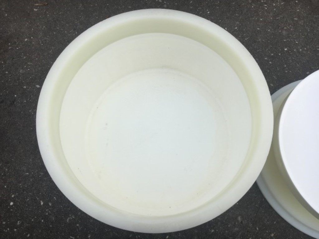 Single forms, Micro perforated. Cylindric with straight corners round shaped. Dimensions cheese: diameter 335 mm, height 140 mm. Weight: 10 kg per cheese. Including mould cover. In total 30 pieces available.