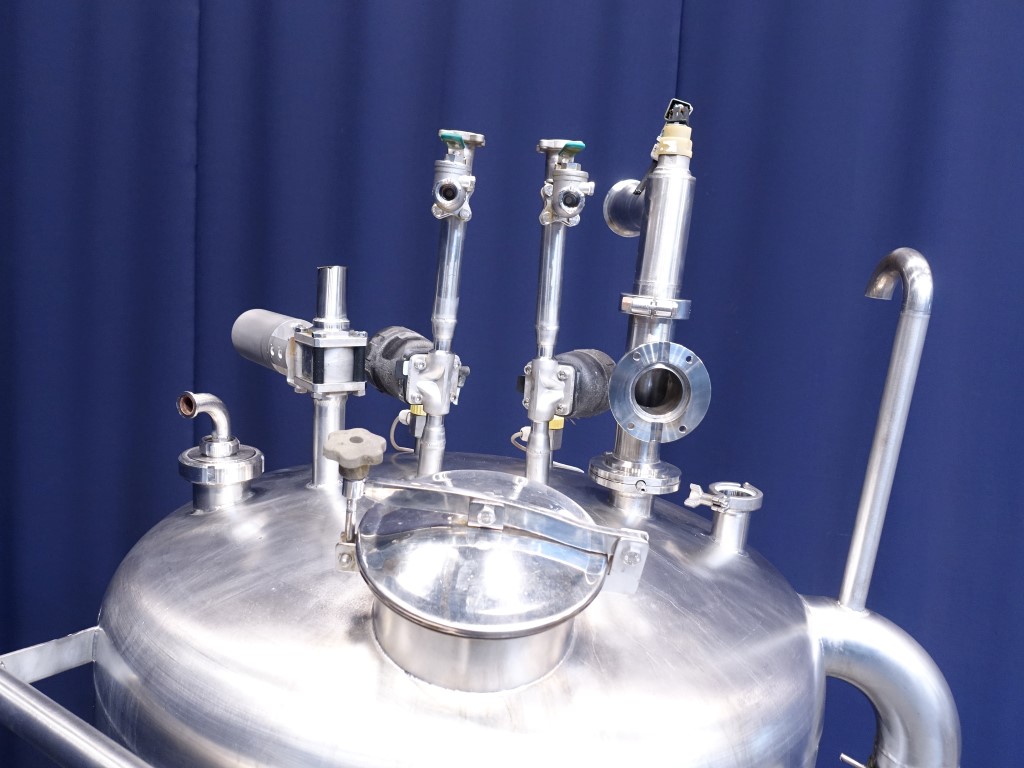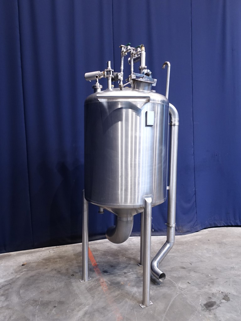 Vertical level tank. Pressure in tank atmospherique. Conical bottom. Product outlet 8'' and outlet height: 50 cm. Connections for: high and low level. Manhole in top, round, diameter 200 mm. 4'' Overflow tube. Breather. Several inlet connections on top. 3 Feet. Inside dimensions of tank: diameter 900 mm and height 1200 mm. Total dimensions: 120 x 110 x 300 cm.
