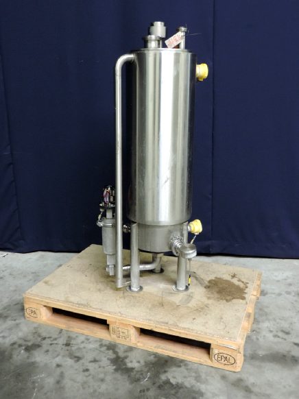 Double jacket. Conical bottom. Flat to the side. Product inlet 1'' / 2'' RJT. Pneumatic butterfly valve. Outlet height: 3 cm. High, low level sensor and pressure sensor. Breather. Jacket capacity: 21 liter. Tank volume: 70 Liter. Total dimensions: 50 x 50 x120 cm.