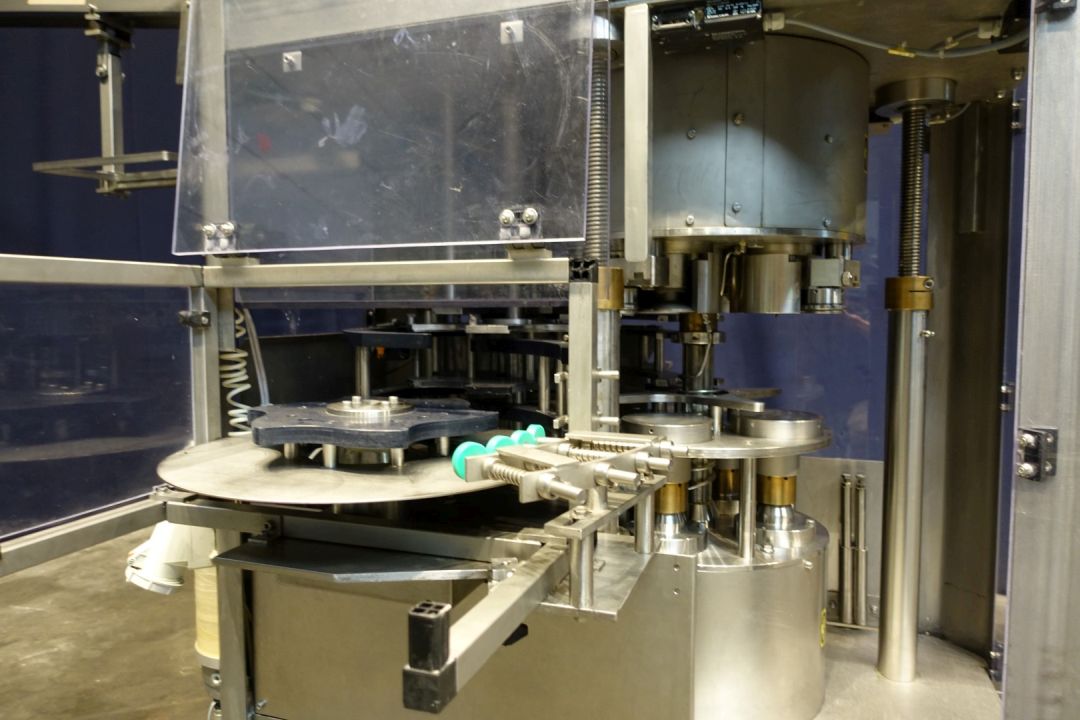 Metal Can closing, seaming machine. Stand-alone and fully automatic. Suitable for seaming lids onto cans, equipped with 4 seaming stations. Working principle: The incoming cans are synchronized to the machine by a specially constructed infeed gear-wheel. An electro-pneumatic system manages the required feed of lids as required (“no can –no lid”). After separation of the lid in the lid magazine, it will be fed to the transfer point of lid & can via the lid/can transfer turret. During its cam-controlled upward movement the filled can receives the lid, which was laid out in a special lid slide. Can and lid are clamped between lifter plate and seaming head.The can is seamed by a start roll and finish roll while the cans are rotating during the seaming process. After the seaming process, the cans are handed over to a outfeed conveyor. Can diameter: 127 mm. Range of can diameter according brochure: 99-153 mm and height 20-250 mm.Electrical: 400 V - 50 Hz - 3,5 kW. Total dimensions: 130 x 120 x 240 cm. Machine is without control panel!