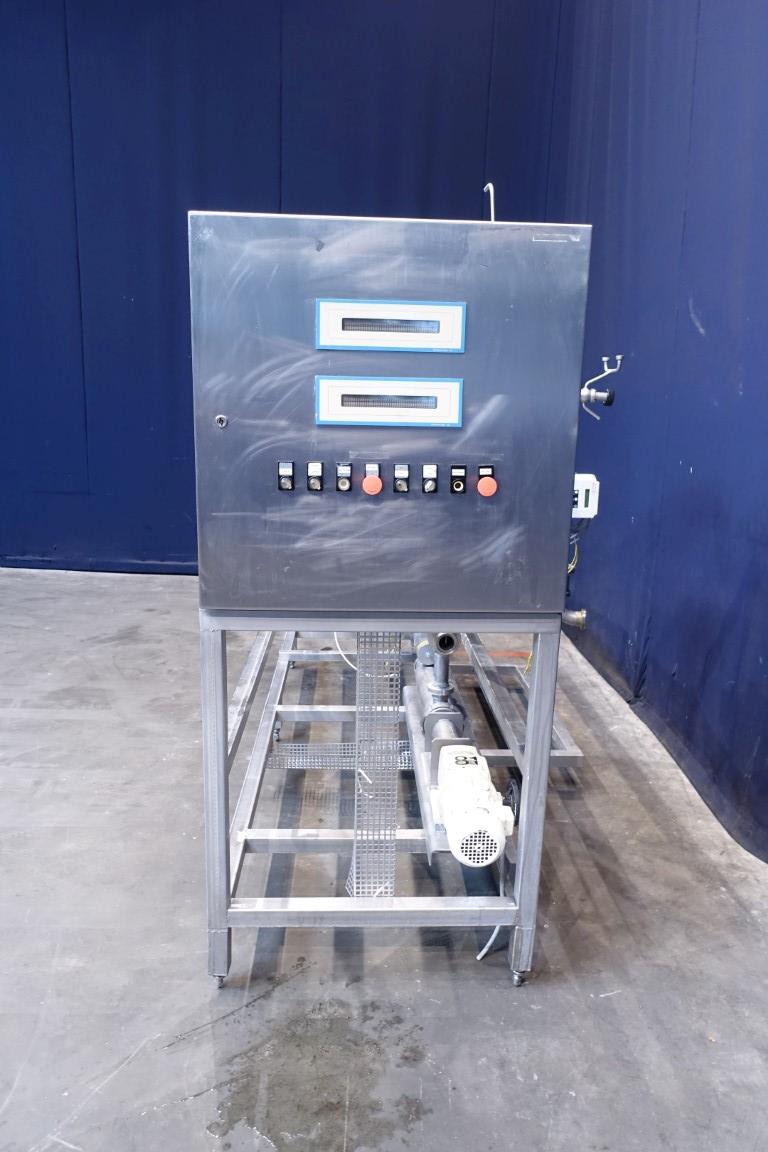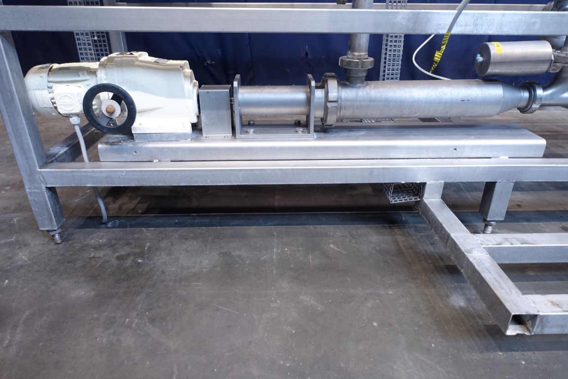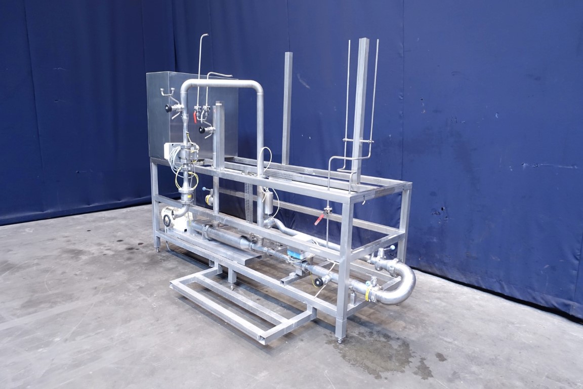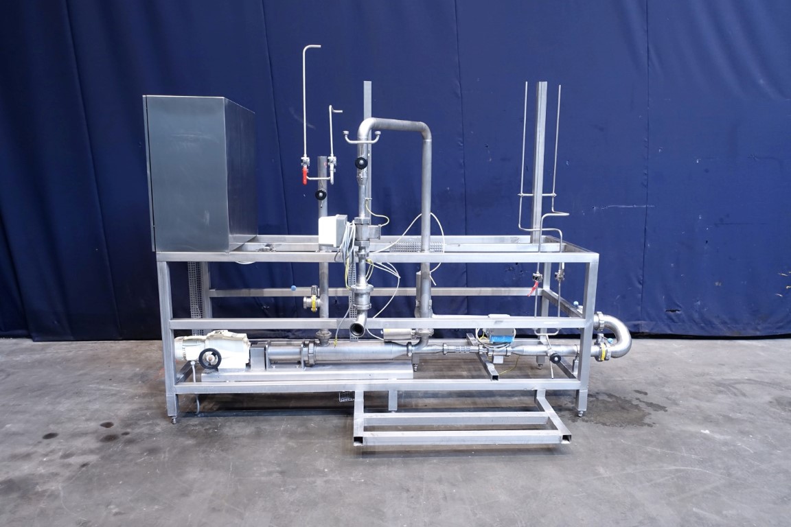 Inline Quark mixing device to add Cream to fresh cheese to increase the fatt content. 2 ingredients, Cream and fresh cheese are added together controlled by 2 flowtransmitters (make ABB). After injecting the cream the 2 ingredients are mixed together in a rotary mixer Miromatic model KME100 (100mm diameter with a variable speed paddle mixer inside), skid mounted including all by-pass and product valves, 3 steamable sample valves, incomplete controls (no program).