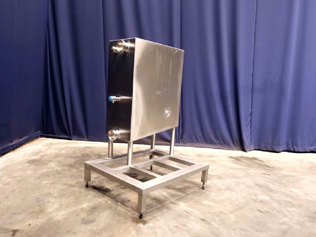 Level tank with total open top. Flat to the side. Product outlet DN80. Connector for temperature sensor. 4 adjustable feet. Inside dimensions 38 x 75 x 70 cm. Total dimensions 110 x 90 x 150 cm.