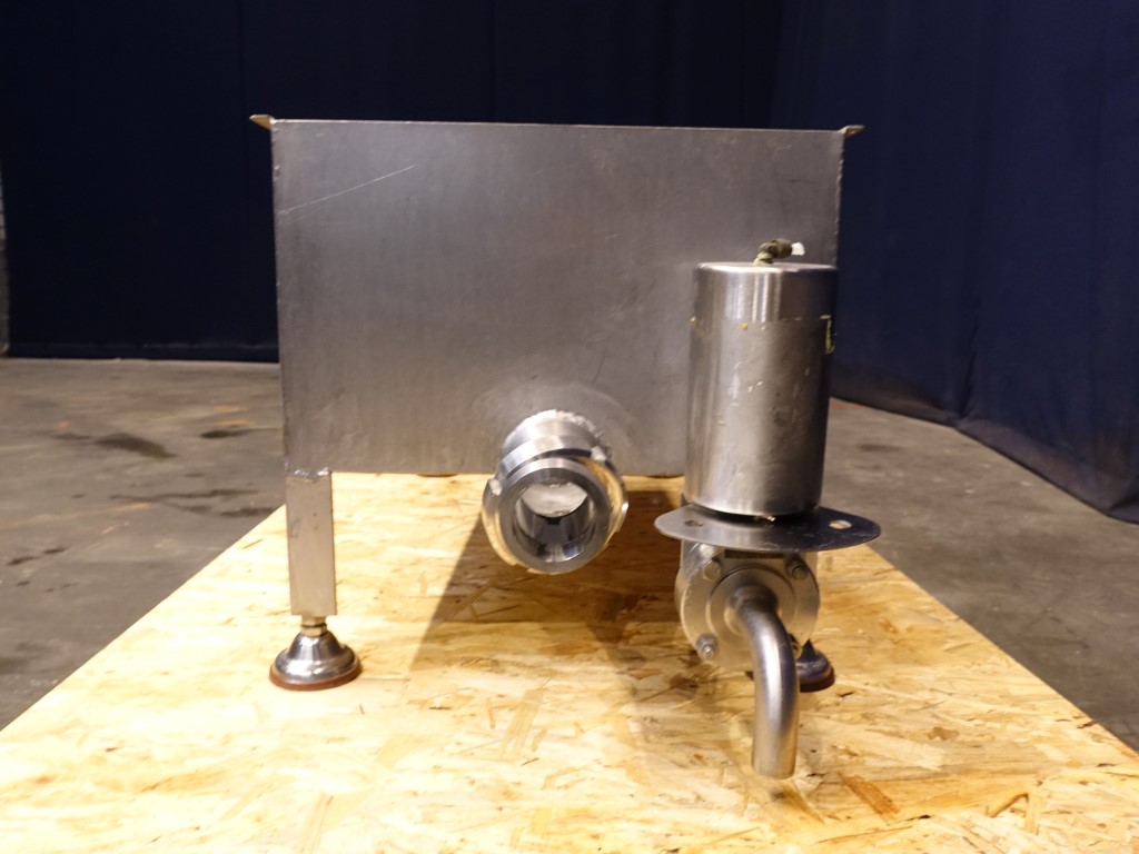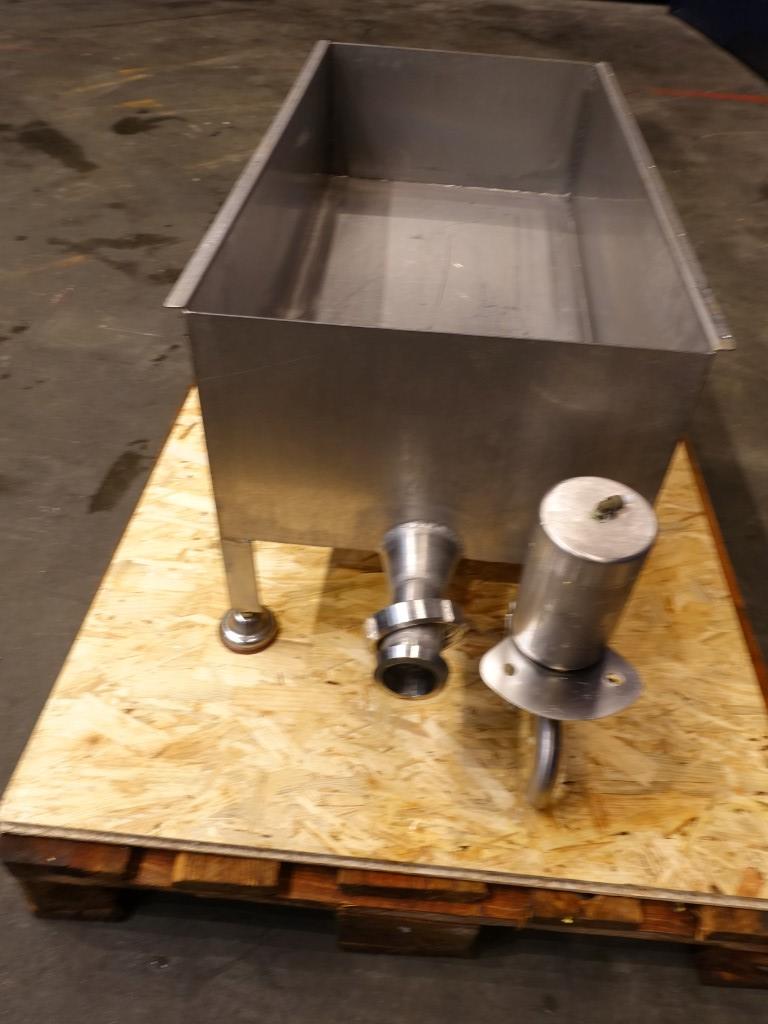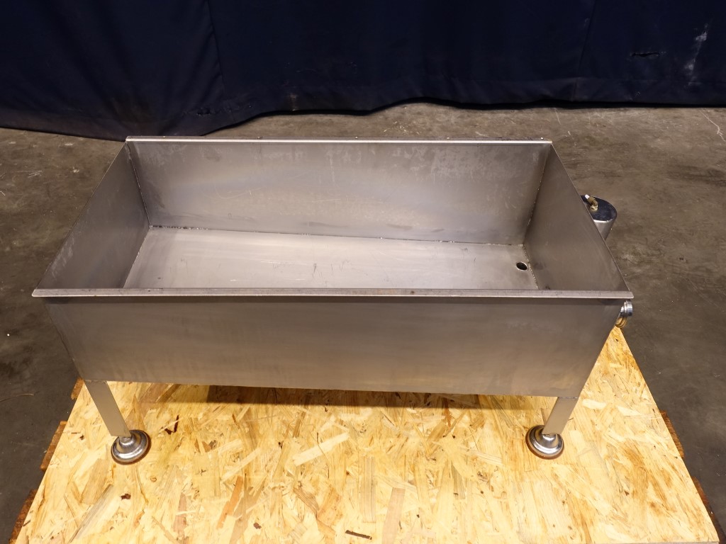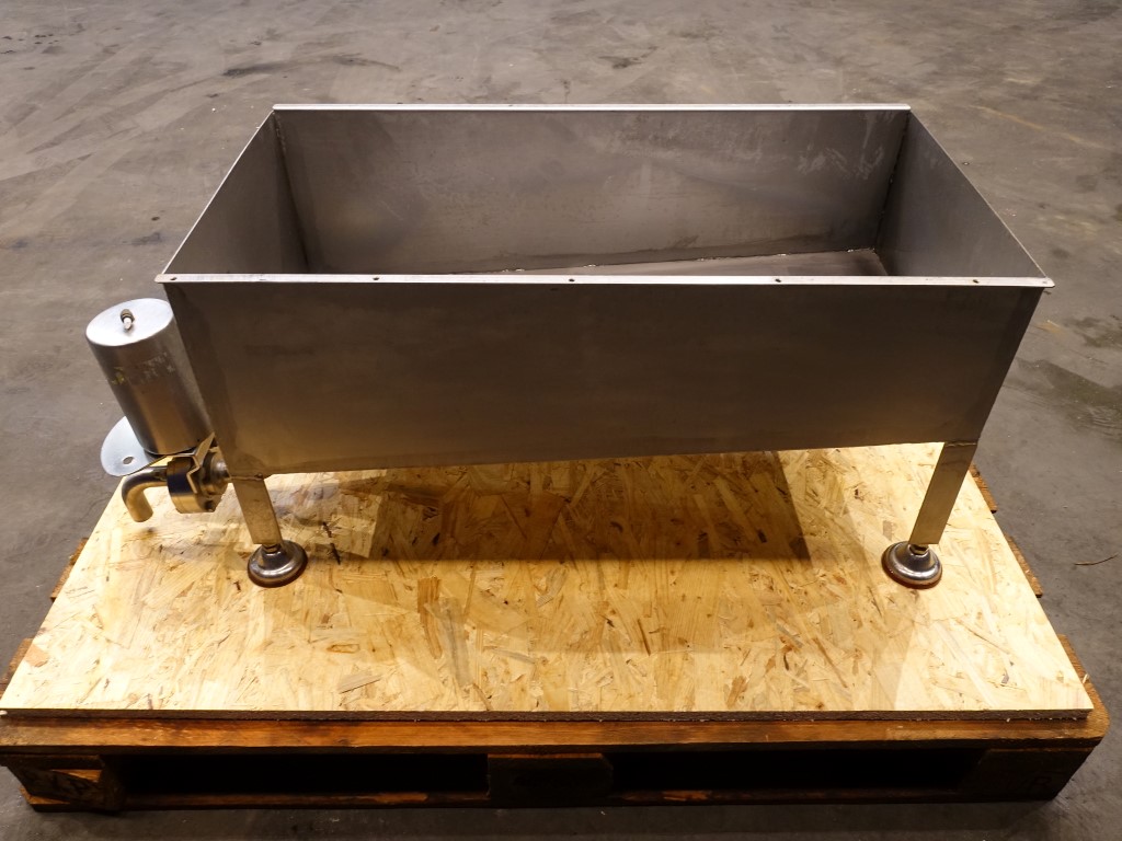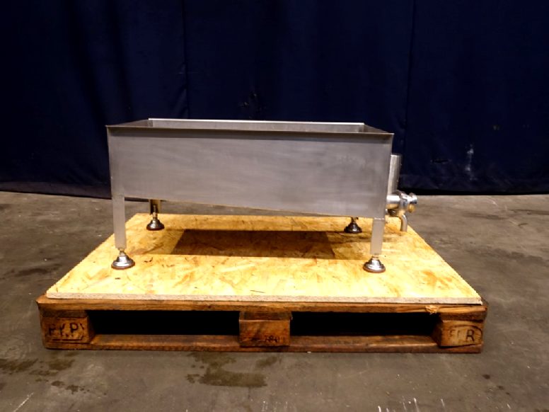 Total open vat. Opening flat to the side. Product Outlet 2'' DIN. 1'' drain with pneumatic butterfly. 4 adjustable feet. Inside dimensions of tank: 79 x 39 x 22 cm. Total dimensions: 105 x 45 x 45 cm.
