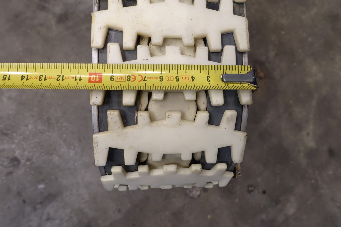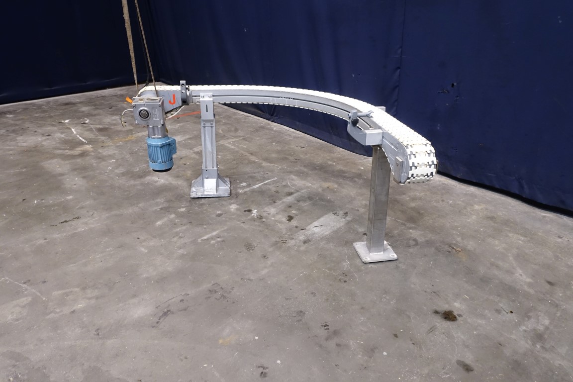 Chain conveyor. Effective Belt: 210 x 10 cm. Motor: 0,37 kW - 1410 rpm. Horizontal. 90° corner. Total dimensions: 180 x 110 x 78 cm.