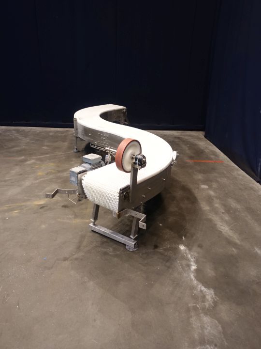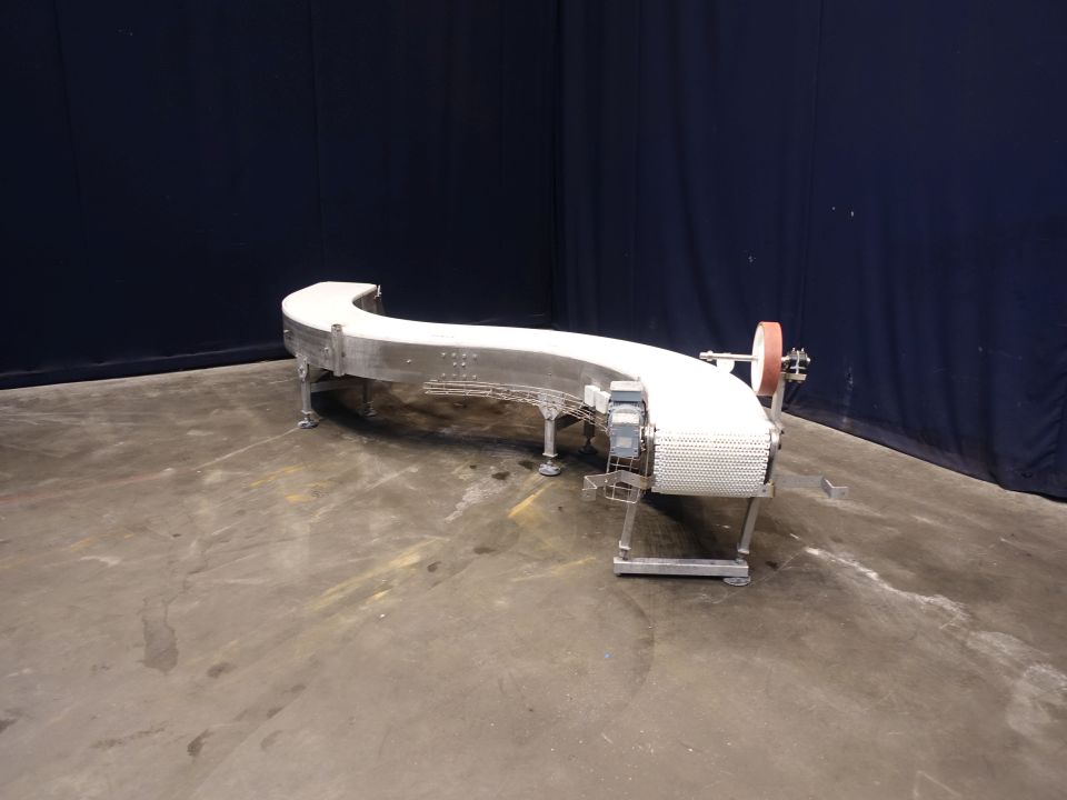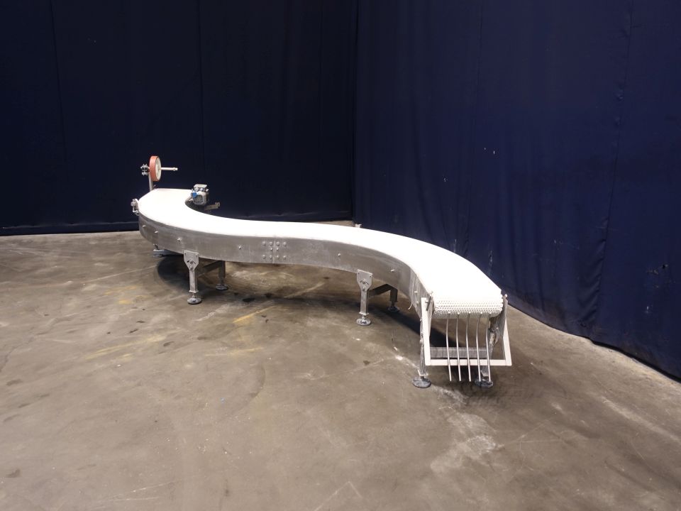 Chain conveyor with S-corner. Effective Belt: 35 x 420 cm. Motordetails unknown (typeshield not readable). Horizontal. Total Dimensions: 400 x 70 x 80 cm.