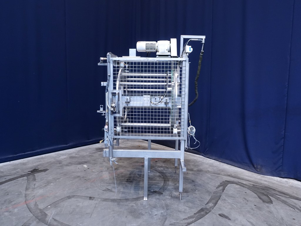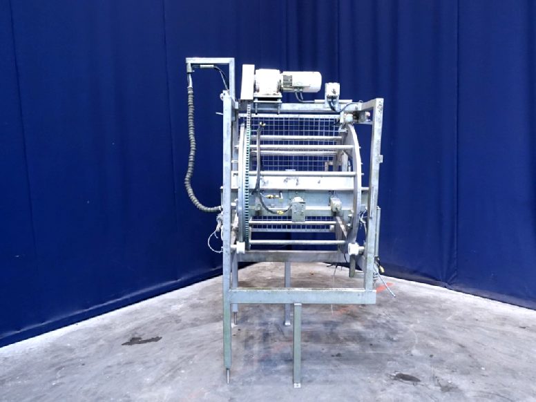 Incomplete cheese turning device. Without conveyors. Rotating: 180°. Motor: 0,75 kW - 2,2 A - 220 rpm. Total dimensions: 140 x 170 x 230 cm.