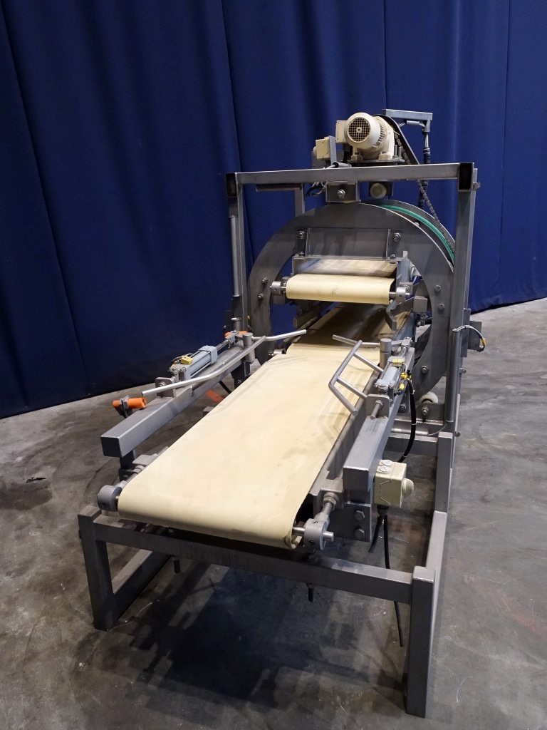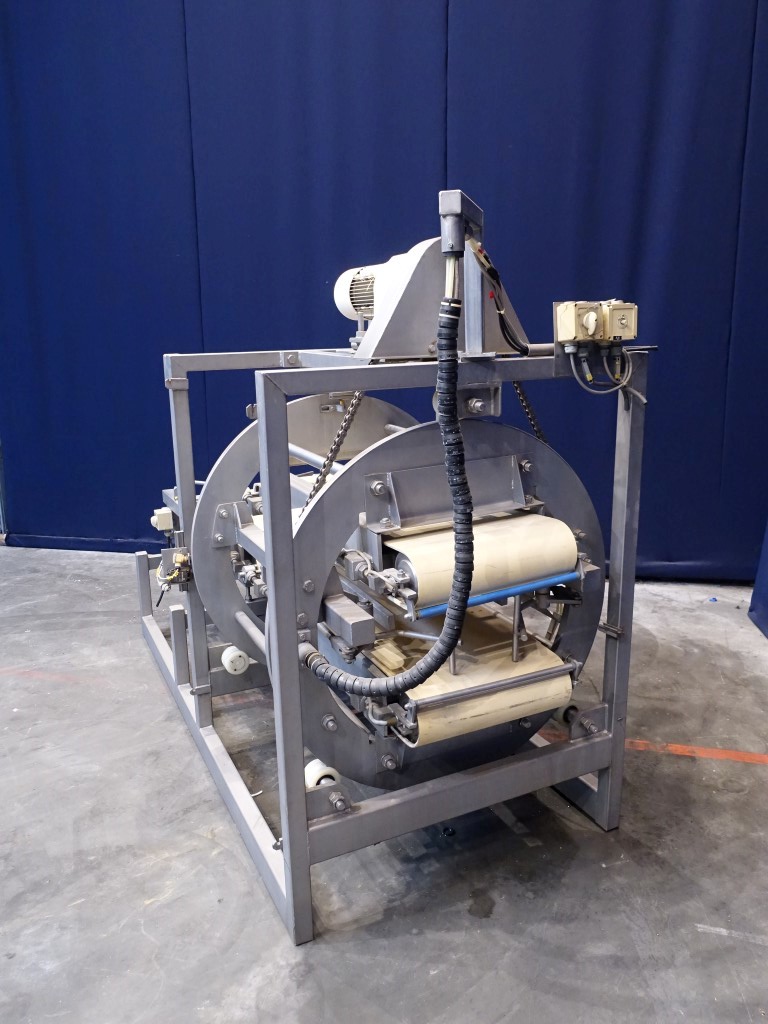 Cheese turning device, top and bottom conveyor, cheese comes in, devices turns 180 degree, conveyor moves the cheese out. Max cheese size: wide 31cm x height 20 cm. Conveyor size: 42 x 120 cm. Including infeed conveyor: 42 x 120 cm. Rotating: 180°. Motor: 0,75 kW - 2,2 A - 220 rpm. Total dimensions: 120 x 290 x 170 cm.
