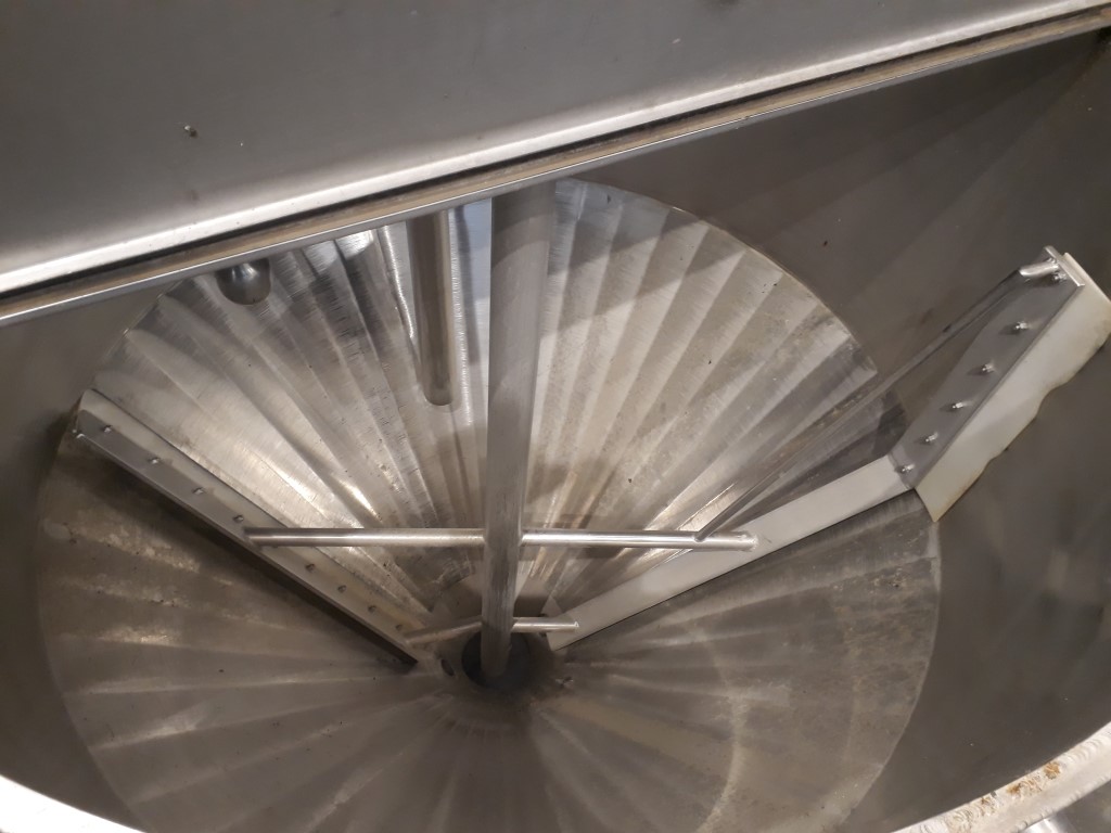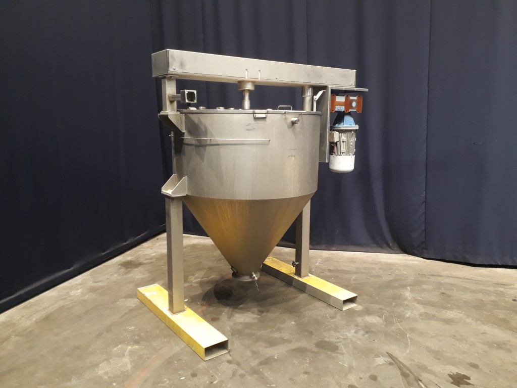Conical hopper with top driven scraper agitator. Motor: ± 5 kW - i: 31,5 - n2: ± 44 rpm Double jacketed side and bottom. Pressure in jacket: unknown. Pressure in tank atmospherique. Conical botom. bottom flange with bearing and outlet missing. 2'' connections on the side, height: 30 cm. 2 CIP spray bowls. Half open top with cover. Hopper inside a stainless steel frame with 2 legs and inserts for easy movement with a forklift. Inside dimensions of hopper: Ø 120 cm and height 200 cm. Total dimensions: 230 x 160 x 220 cm.