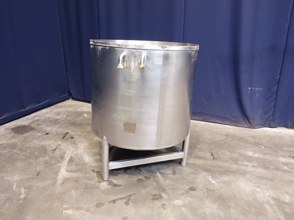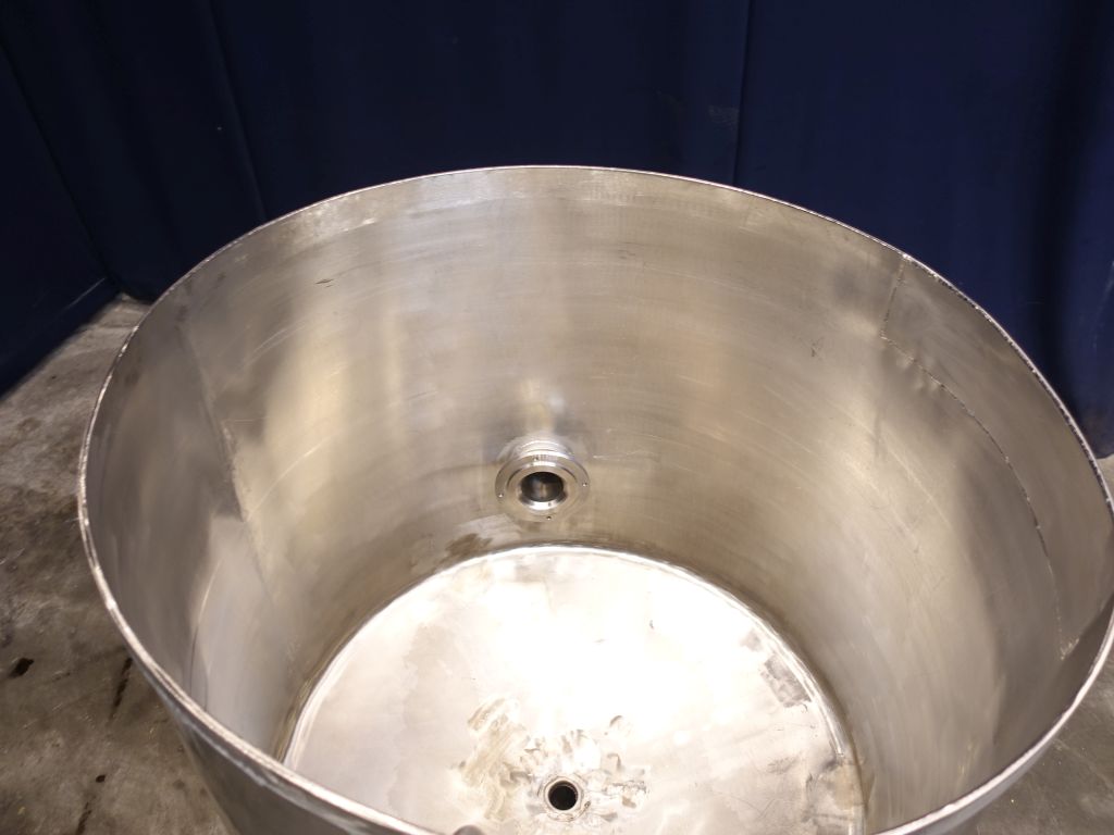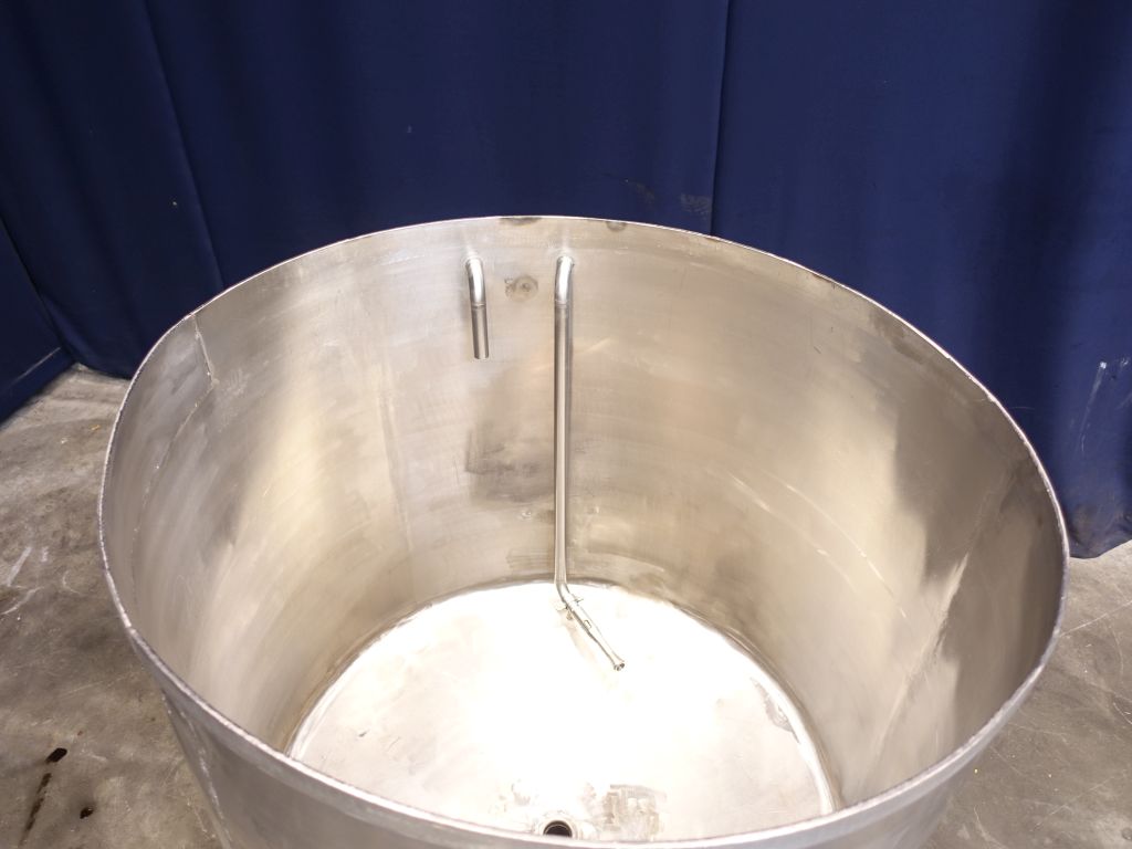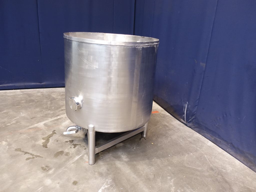 Level tank. Total open top. Conical bottom. Product outlet, 2'' with manual ball valve. Outlet height: 15 cm. 3 Feet. Inside dimensions of tank diameter 95 cm, height 85 cm. Total dimensions: 105 x 105 x 120 cm.