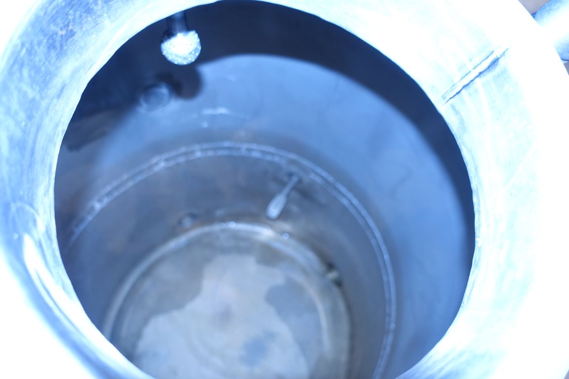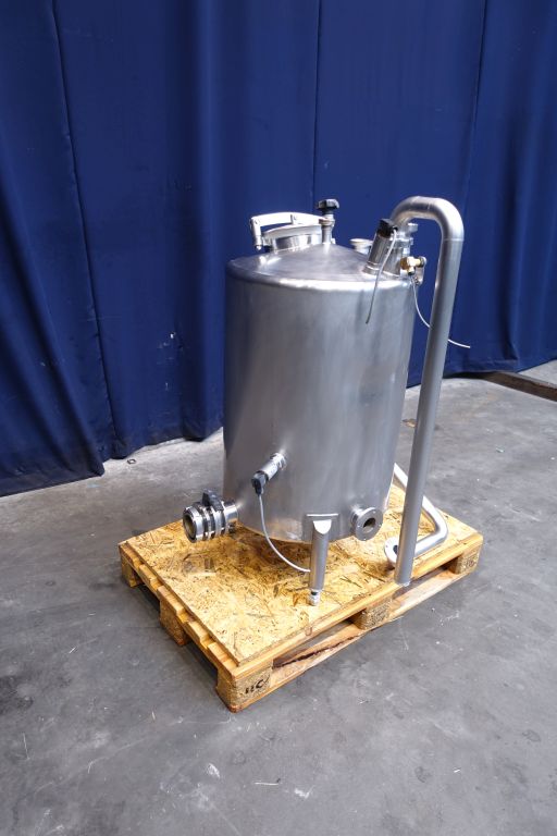 Closed leveltank. Manhole in top 20 cm. Flat to the side. Product outlet, DN65 DIN, outlet height: 25 cm. Manual butterfly valve. Connectors for high and low level @30 cm. CIP spray bowl. 3 Adjustable feet. Inside dimensions of tank diameter 58 cm and height 75 cm. Total dimensions: 75 x 80 x 130 cm.