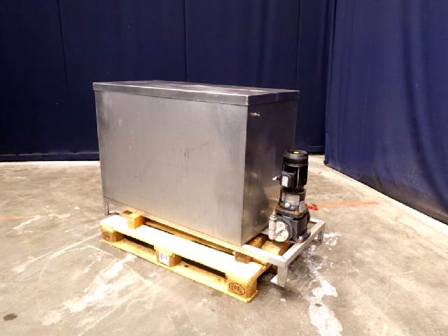 Leveltank. Open top with cover. Outlet flat to the side. Including Pentair centrifugal pump, type: PVM 1-2F, capacity: 0,7-2,4 m3/h, max. 25 bar, motor: 0,37 kW - 1,4 A - 2850 rpm. Frame mounted. Inside dimensions of tank 59 x 119 x 80 cm. Total dimensions: 150 x 65 x 100 cm.