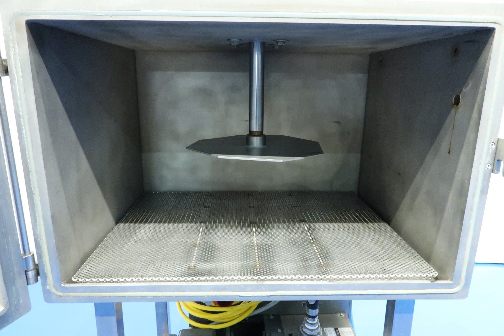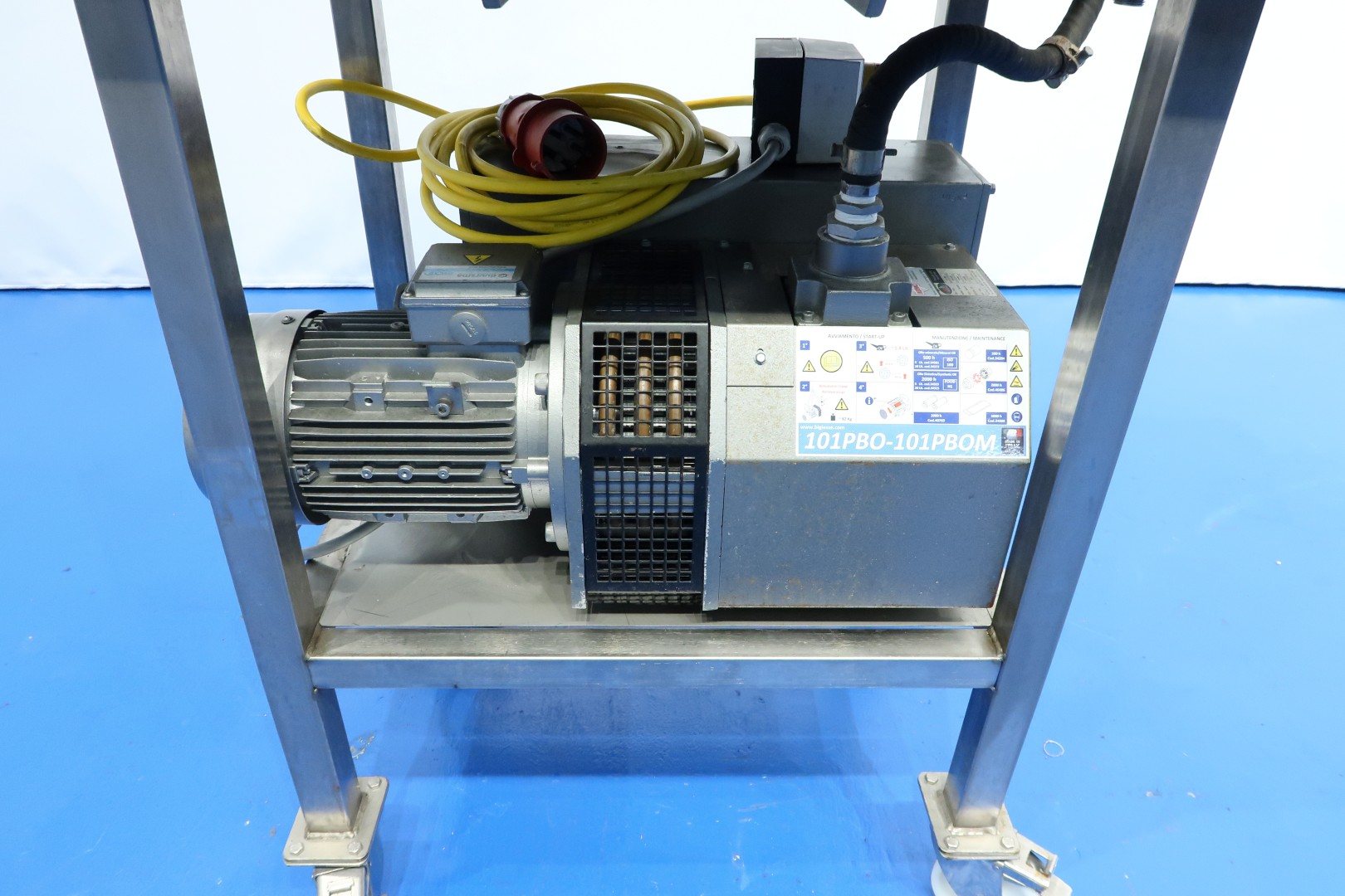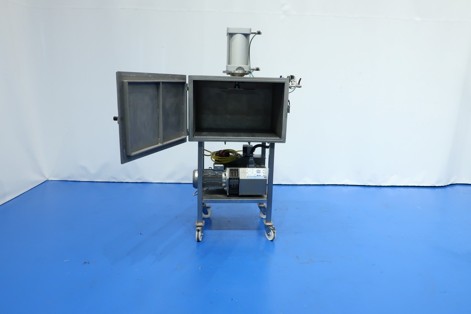Pilot vacuum cheese press with 1 cilinder on mobile SS frame. Chamber dimensions: 80x60x53 (lxwxh) cm. Max heigth under pressplate 42 cm, min height under pressplate 22,5 cm. Inner wall coagurated coating. With Induvac vacuum pump: max vacuum 10 mbar - capacity 100 m3/h. Vacuum system to influence structure and shape of cheese. Total dimensions: 100x70x197 (lxwxh) cm - weight: 350 kg.