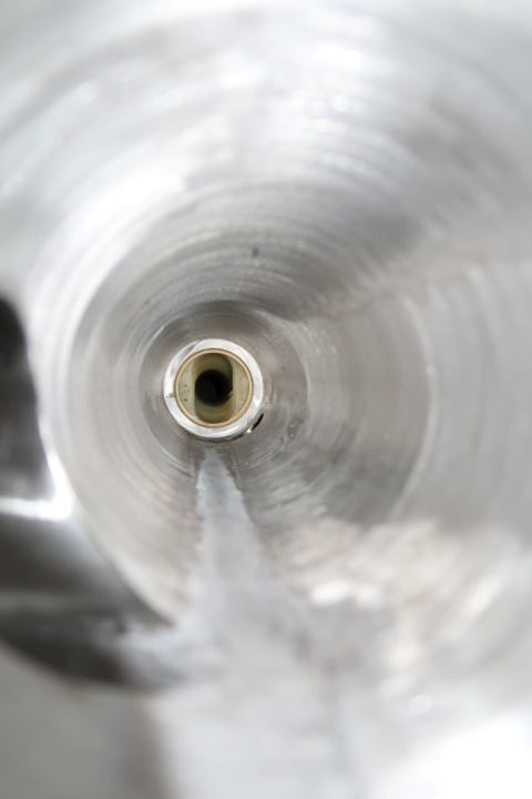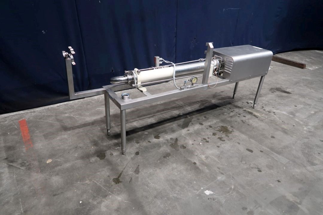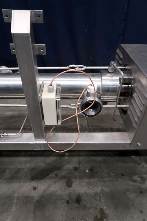 Screw / mono pump. Stator diameter: 100 mm. Rotor diameter 35 mm. Rotor length 450 mm. 4 Windings. Current motor: 1,5 kW - n1 1420 rpm - n2 = pump speed 50 rpm. Stainless steel cover over electric motor. Frame mounted, housing for by-pass valve (actuator missing), flow transmitter between flanges (unknown brand). Connections: 2'' DIN/2,5'' SMS.