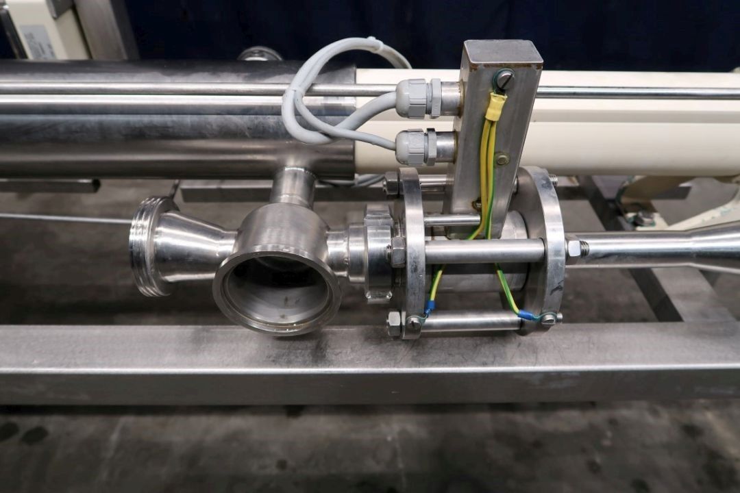 Screw / mono pump. Stator diameter: 100 mm. Rotor diameter 35 mm. Rotor length 450 mm. 4 Windings. Current motor: 1,5 kW - n1 1420 rpm - n2 = pump speed 50 rpm. Stainless steel cover over electric motor. Frame mounted, housing for by-pass valve (actuator missing), flow transmitter between flanges (unknown brand). Connections: 2'' DIN/2,5'' SMS.
