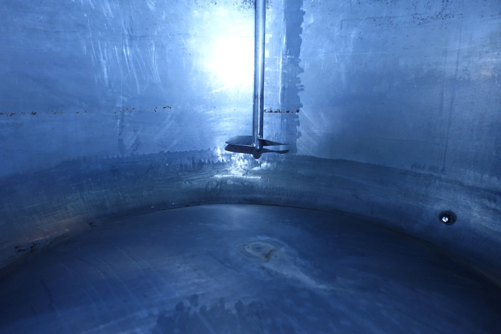 Single jacketed vertical storage tank with propellor agitator. Top driven propellor agitator, motor: 0,25 kW - 1,2 A - n: 470 rpm. Product outlet 2" Din, outlet height: 35 cm. 1 x Level sensor in top and 1 x connection for level sensor low side of the tank. 1 CIP spray bowl. Manhole in side, oval 42,5x32 cm. 3 Adjustable feet. Inside dimensions of tank: Ø 170 cm. Total dimensions: 170x170x365 (lxwxh) cm - weight: 410 kg.