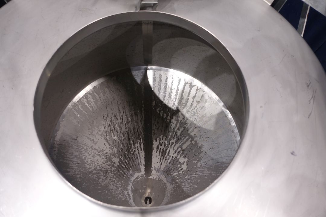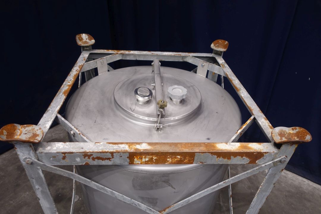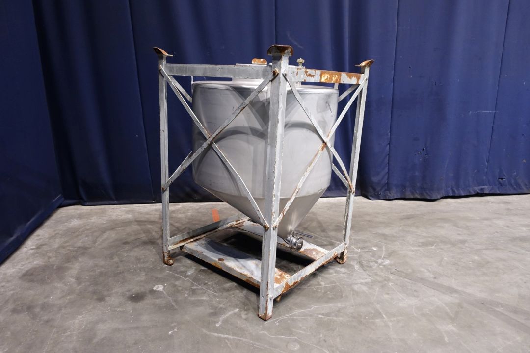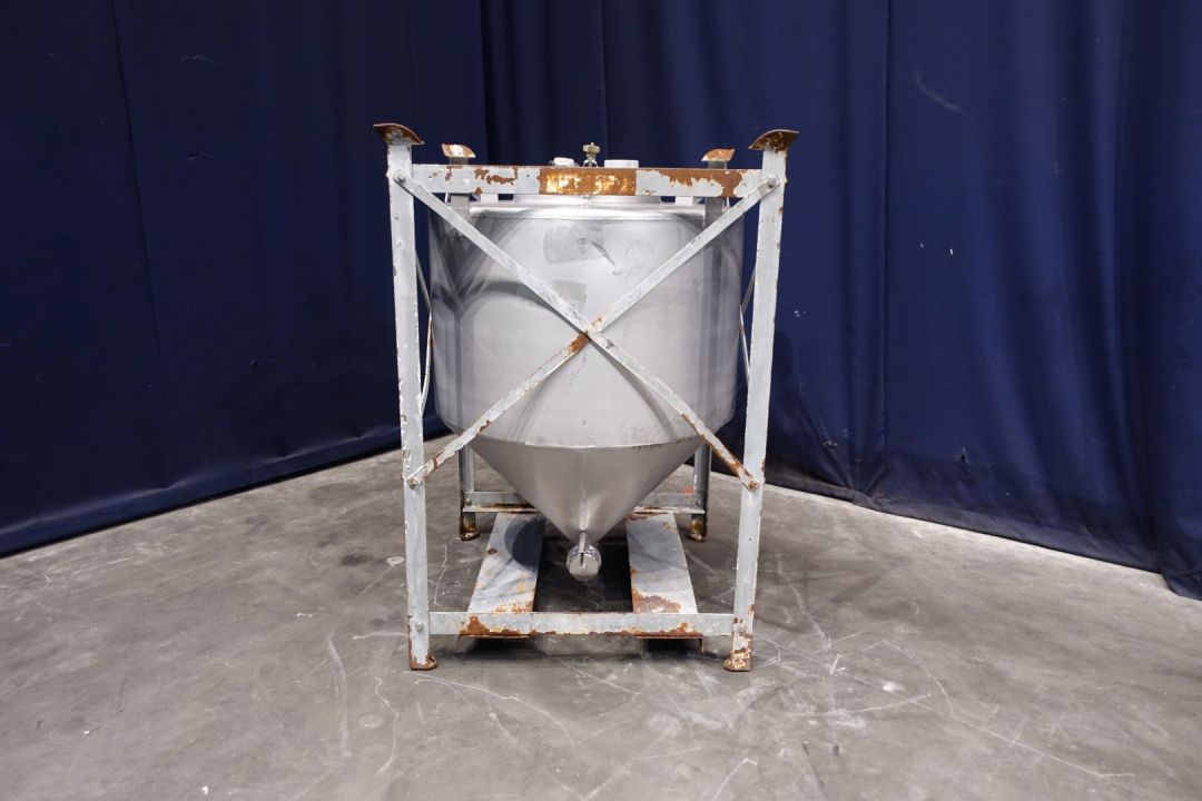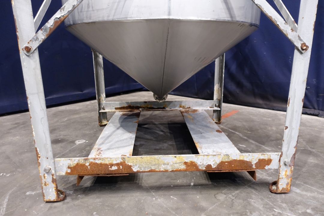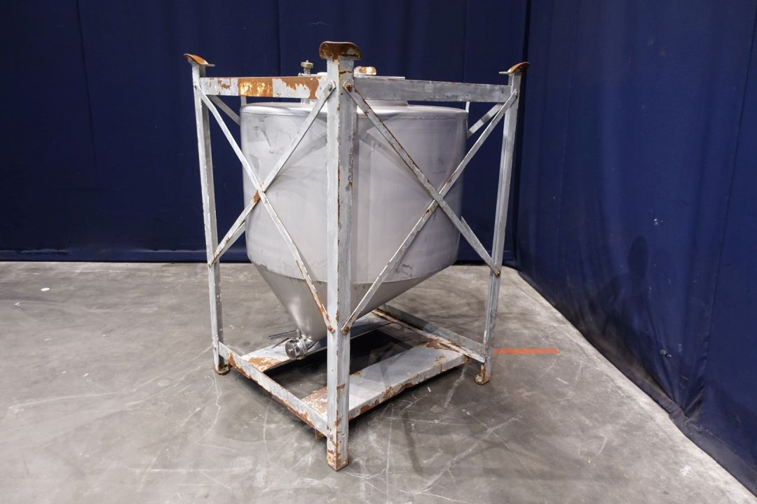 Single jacketed funnel shaped stainles steel tank in stackable steel transportframe. Manhole in top round Ø 45,5 cm. Breather in manhole lid and input connection in manhole lid 2" Din. Product Outlet 2,5" DIN, outlet height: 27 cm, with manual butterfly valve. Innner dimensions of tank diameter 100 cm height 62 cm straight, 49 cm conical. Conical to bottom down degree 61°. Outer dimensions lxwxh: 108 x 108 x 155 cm.