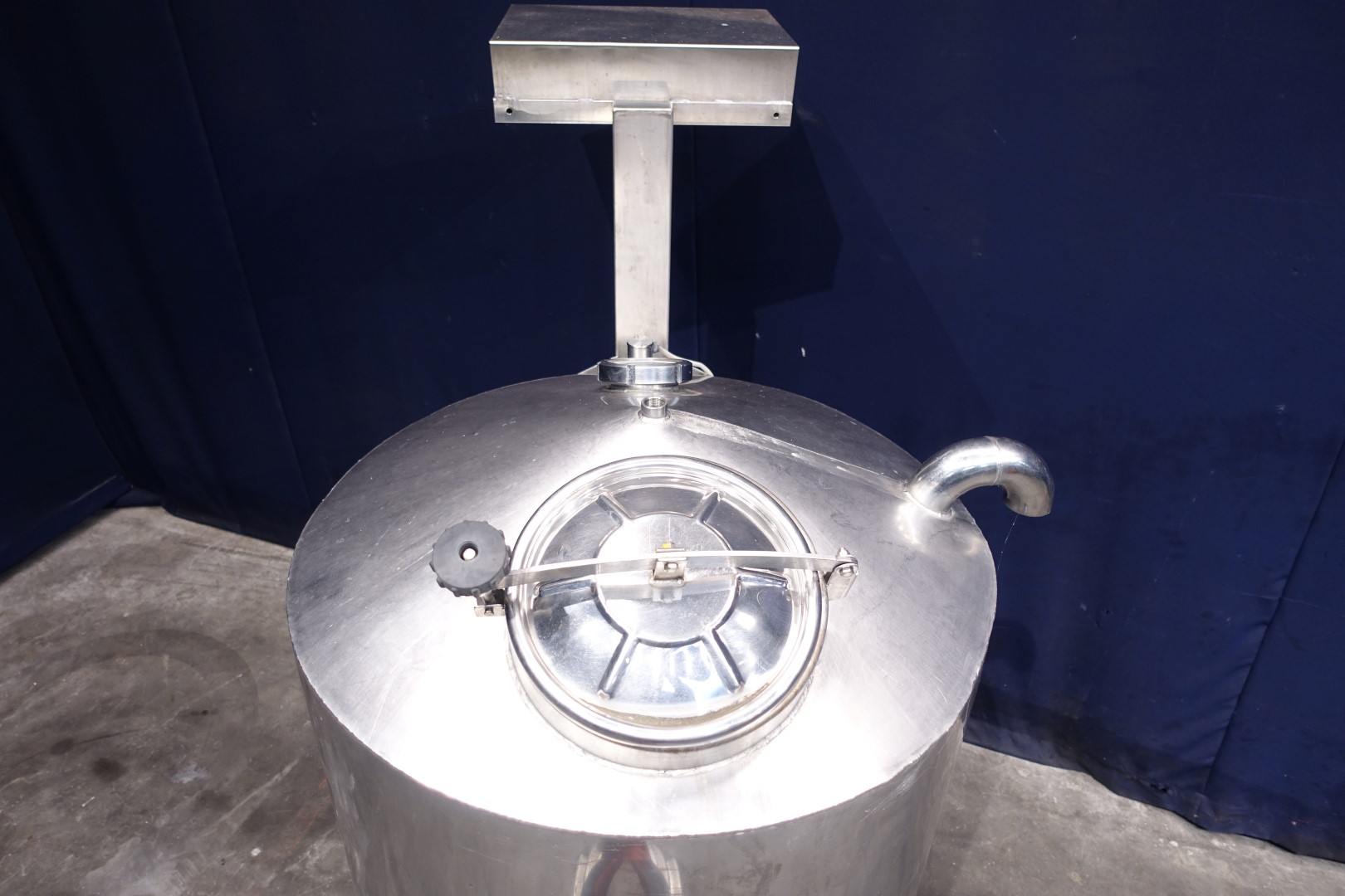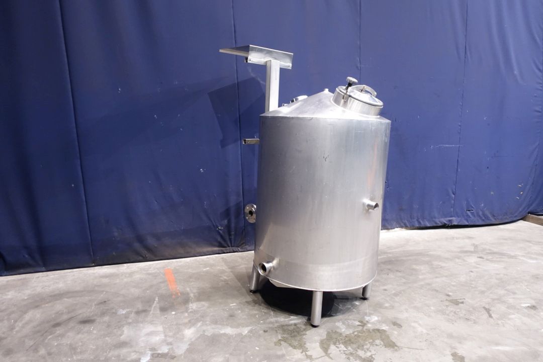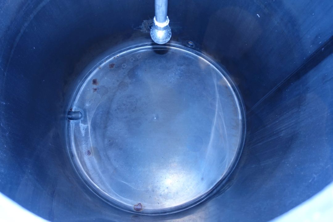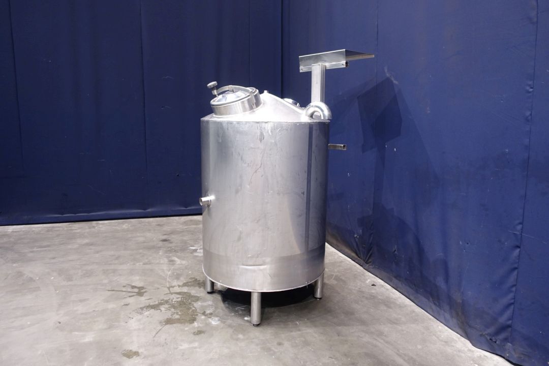 Single jacketed water tank. Product outlet 2,5" DIN and outlet height: 37 cm. inlet on side with flansh. 1 x Level sensor high. Breather 180° bent pipe. 1 CIP spray bowl. Manhole in top, round, diameter 30 cm. Sightglass in top. 4 Adjustable feet. Inside dimensions of tank: Ø 95 cm and height 100 cm. Total dimensions: 120 x 145 x 195 cm.