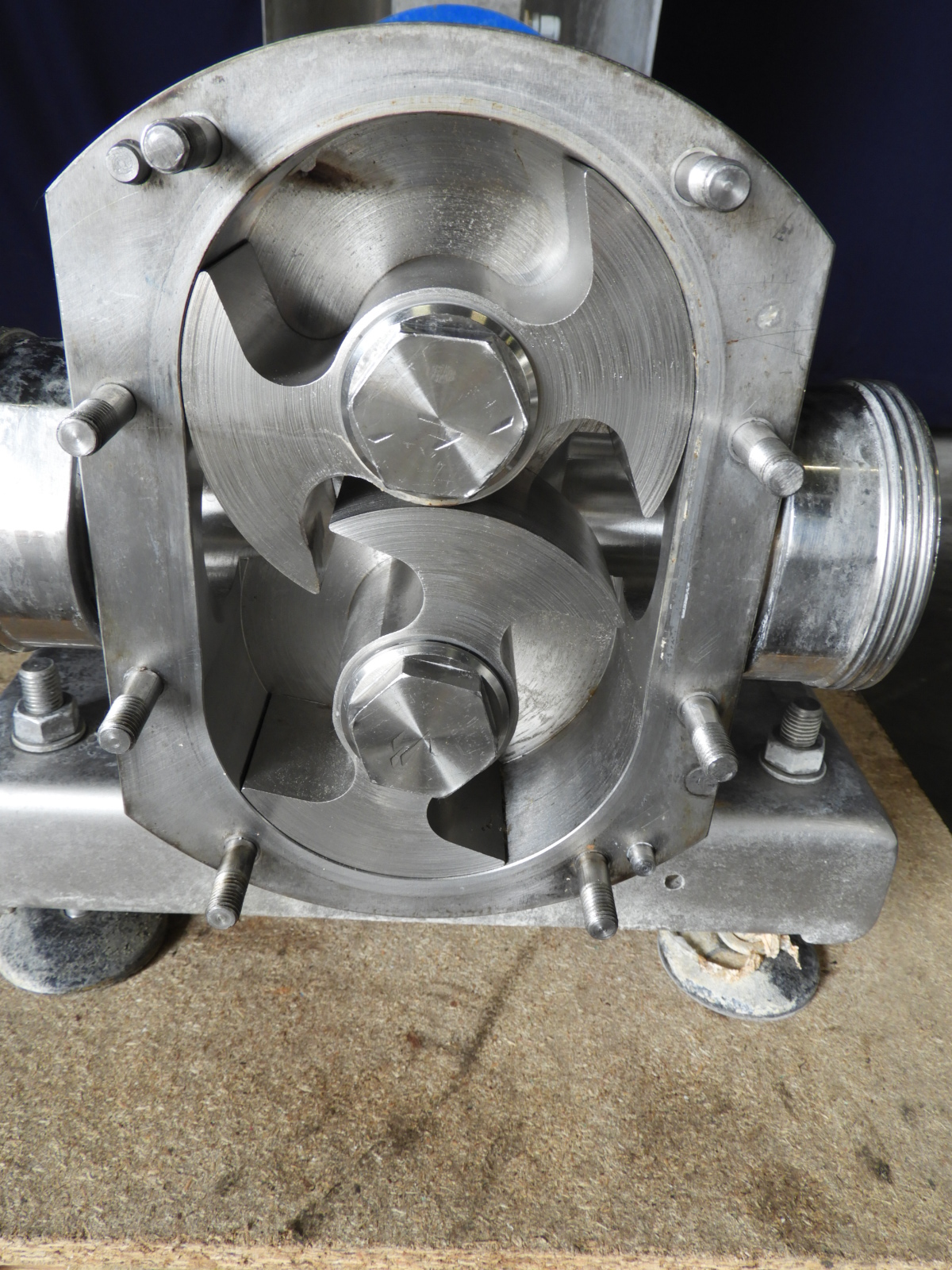 Lobbe pump with duo stainless steel lobbes. Diameter lobbes: 125 mm. Displacement per revolution: 0,55 ltr. Nominal capacity 23,7 m3/h. Maximum: 720 rpm. Current drive work: motor: 7,5 kW - n1: 1450 rpm - i=4,5 - n2: 322 rpm. Stainless steel cover over electric motor. Design pressure up to 10 bar. Mounted on frame. Connections: 2'' / 2'', DIN.