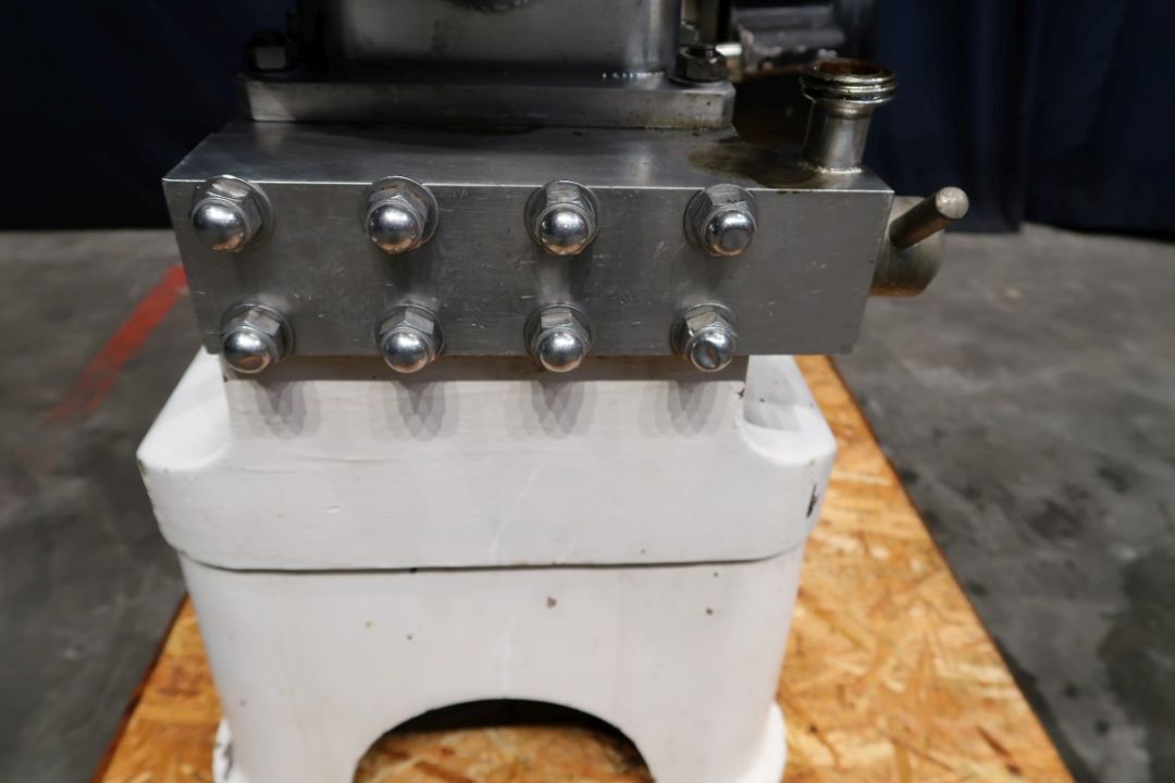 Special Quark smoothing homogeniser, with obturator housing, special screw typ homogenising head, available can be changed on request for more or less moother result, 3 pistons, piston diameter 40 mm. Connections: input hopper, volume: 80 ltr. Motor power: 4 KW working pressure 85 bar.